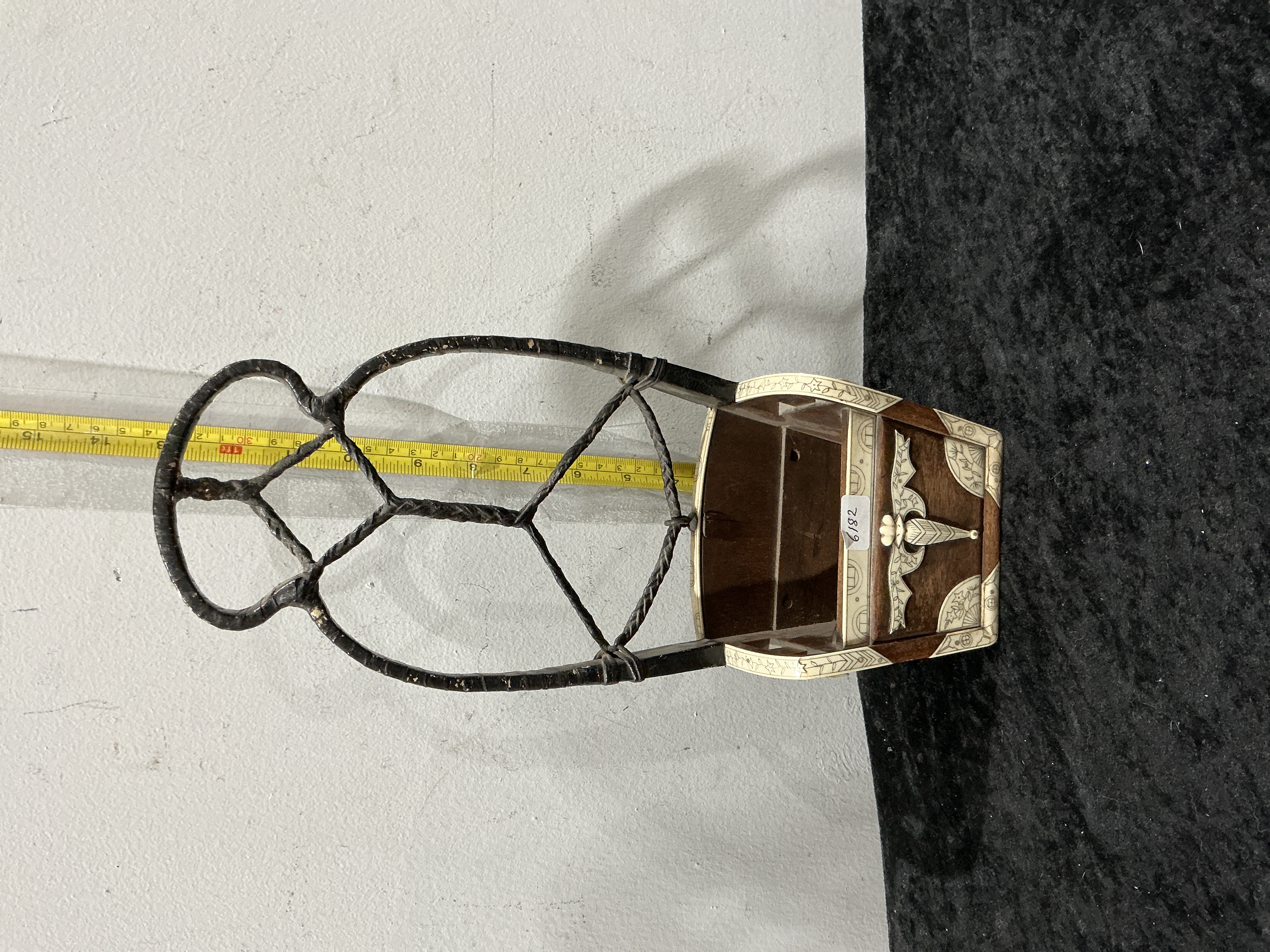 An Anglo-Indian Etched Bone Inlaid Wood and Leather-Wrapped Wire Wall Pocket