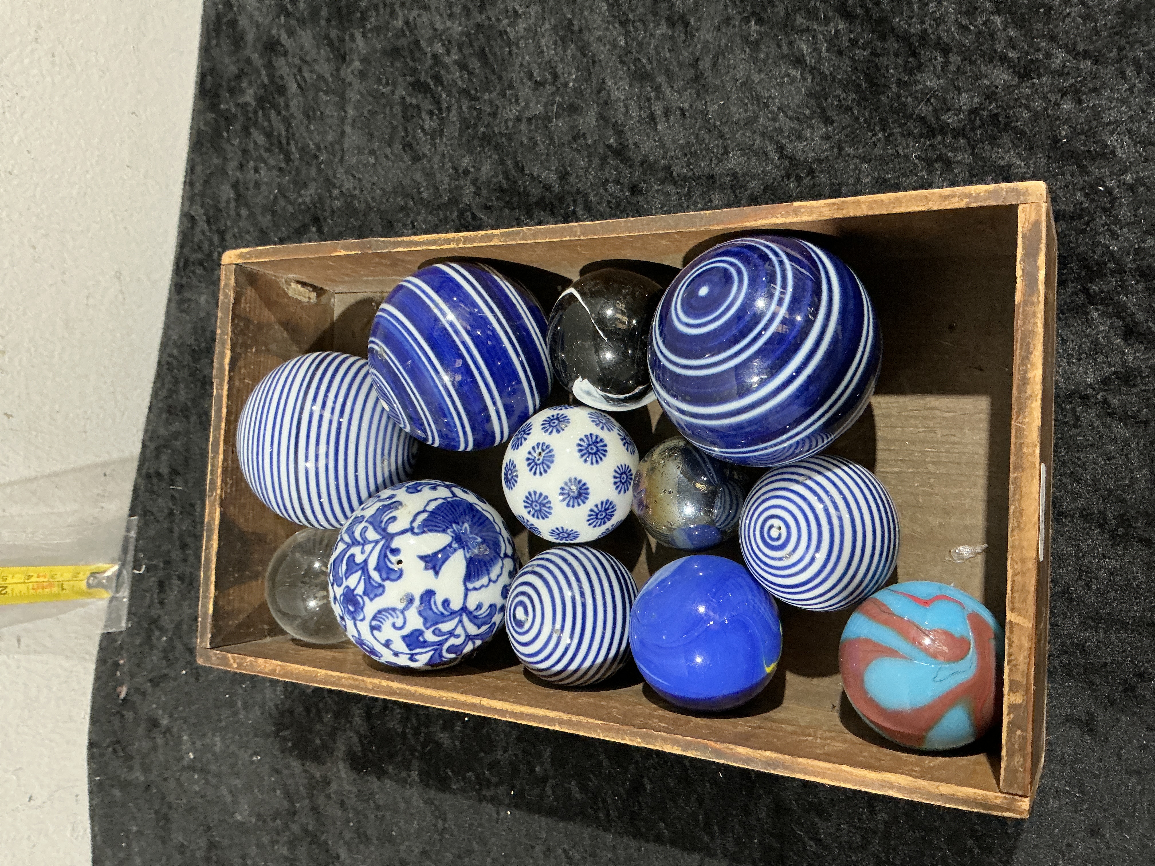 A curated assortment of decorative spheres comprising seven ceramic carpet bowls and five glass marbles, presented within a rectangular wooden display tray. The ceramic items are crafted from porcelain with a classic blue and white glaze. Patterns include horizontal banding, concentric rings, a repeating floral sprig motif, and a traditional Chinoiserie foliate design. The glass components include a large marble with red and light blue swirls, a solid cobalt blue sphere, a clear glass sphere, and smaller marbles with iridescent and swirled black and white patterns. The wooden tray features mitred corners and a natural finish. These items are reminiscent of traditional Victorian indoor bowling games but are styled for contemporary decorative use. Tray measures approximately 30cm x 15cm; largest ceramic sphere approximately 8cm in diameter.
