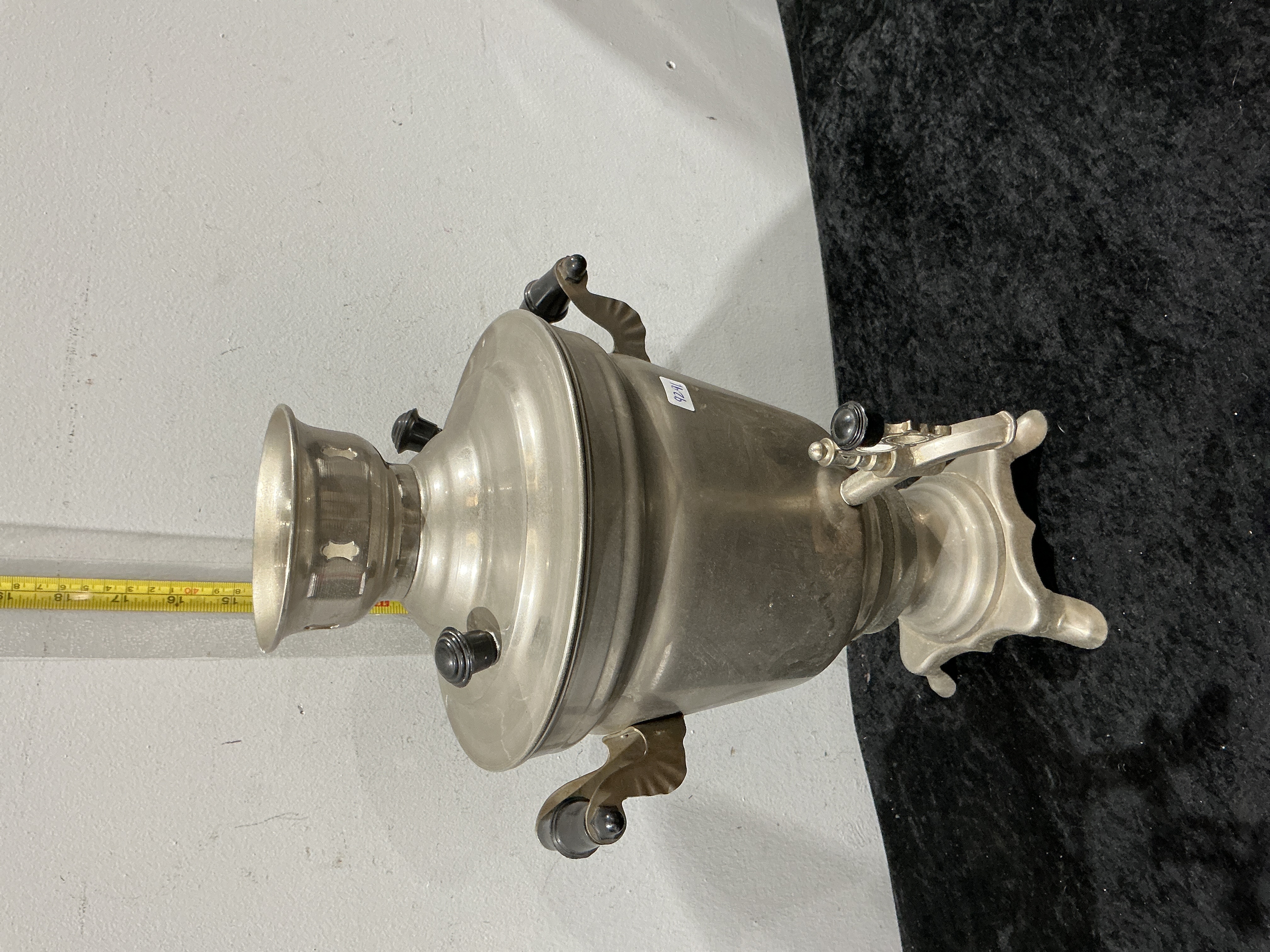 The samovar is in good vintage condition with wear consistent with age and use. The nickel-plated surface shows light tarnishing, scattered surface scratches, and a few minor dings to the body. The turned grips are secure and intact. The interior has not been tested for water tightness or functionality.