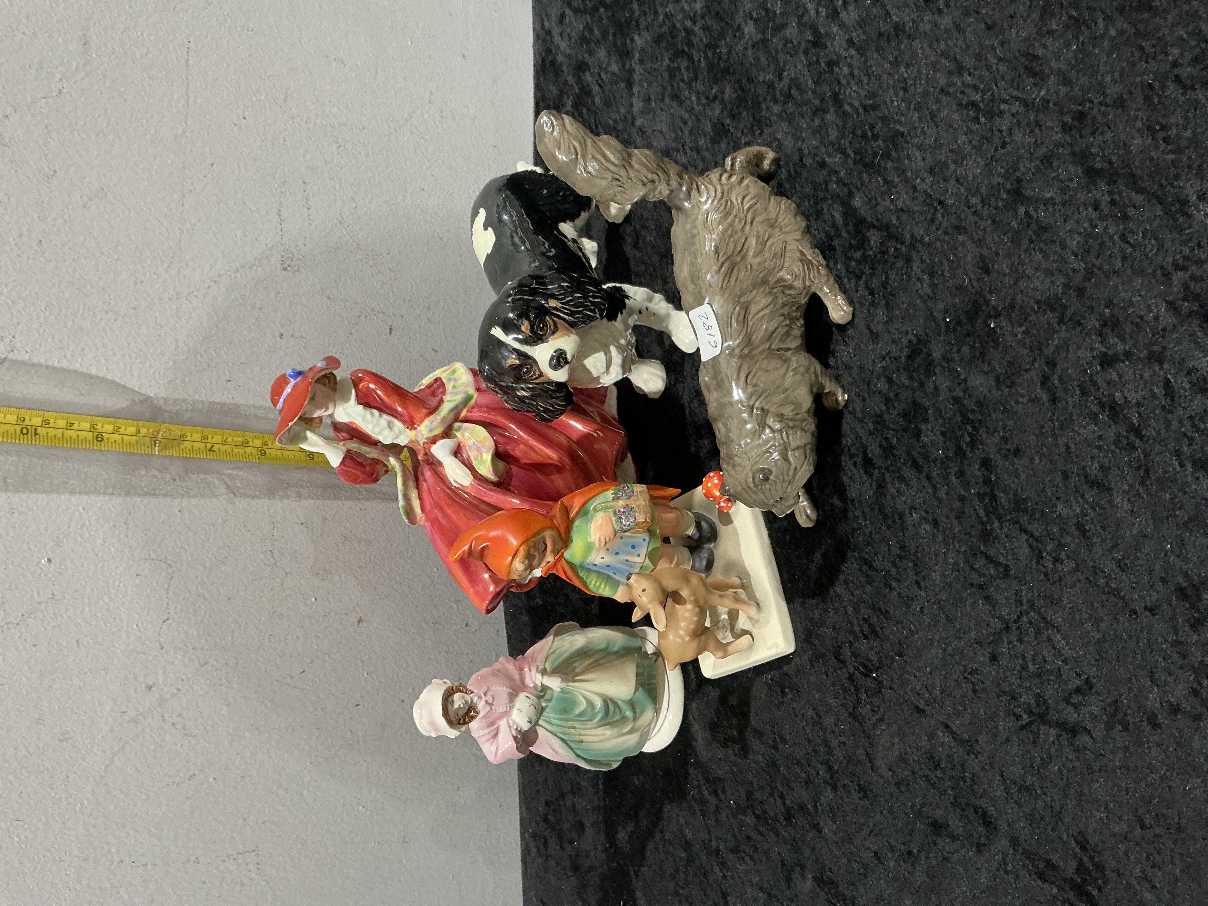 A collection of five decorative figurines. Includes a Royal Doulton glazed porcelain figure titled Top o’ the Hill, likely HN1834, depicting a woman in a flowing red dress and hat. Also includes a Goebel Hummel ceramic figure titled Friends, model 136, modelled as a young girl with a fawn. The set is completed by a small porcelain lady in a pink and green dress, possibly Royal Doulton Tootles, a ceramic Cavalier King Charles Spaniel with black and white markings, and a brown glazed shaggy terrier. Factory marks are expected on the bases of the branded pieces. Height 18 cm.