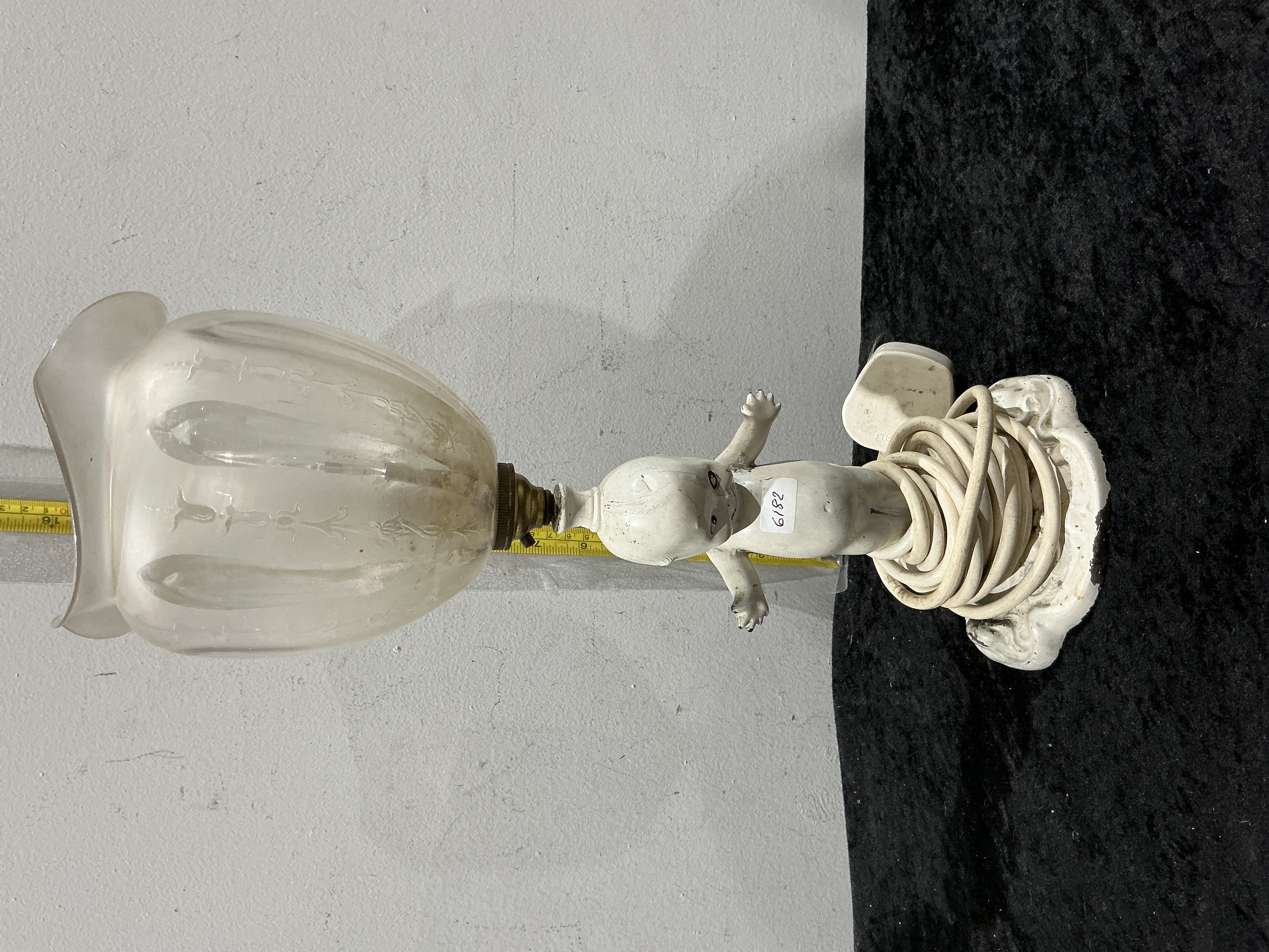 The lamp has been rewired with a modern cord and plug, however, it is sold as-is for decorative purposes and must be PAT tested by a qualified electrician prior to use. The frosted glass shade is in generally good condition with no apparent major chips or cracks, though it exhibits some interior surface grime. The painted metal base shows significant signs of age and wear, including prominent paint loss, chipping to the figure\'s torso and limbs, and accumulated surface dirt.