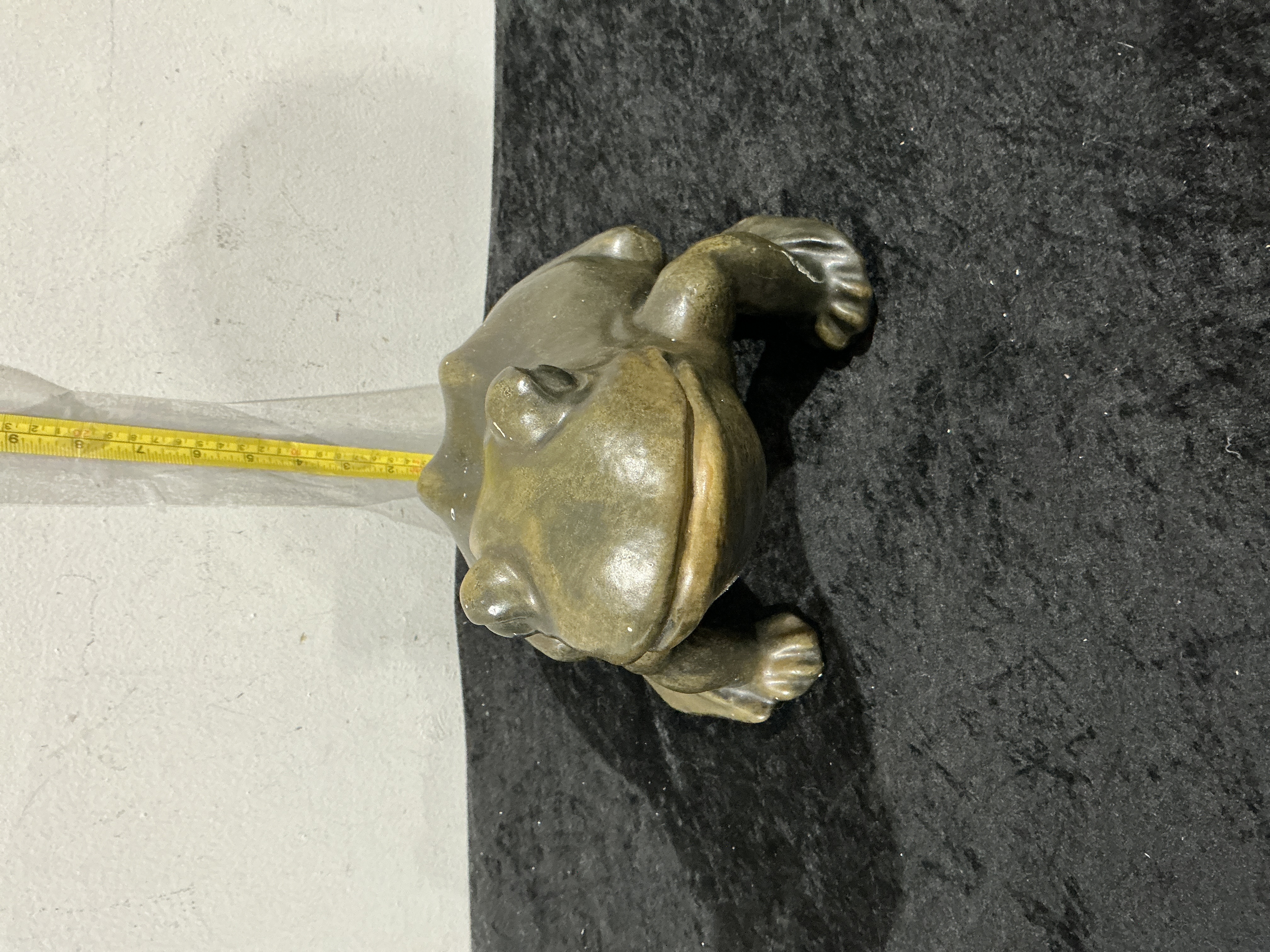 An unmarked decorative frog figurine or garden sculpture, designed in a whimsical, chubby pose. The piece is crafted from a cast composite material, likely resin, featuring a weathered, bronze-toned patinated finish. This item is a solid decorative object and does not possess any electrical components, sockets, or wiring. There is no shade present. The underside is hollow and displays a rough, green-painted base. Dimensions: Approximately 8.5 inches in length.