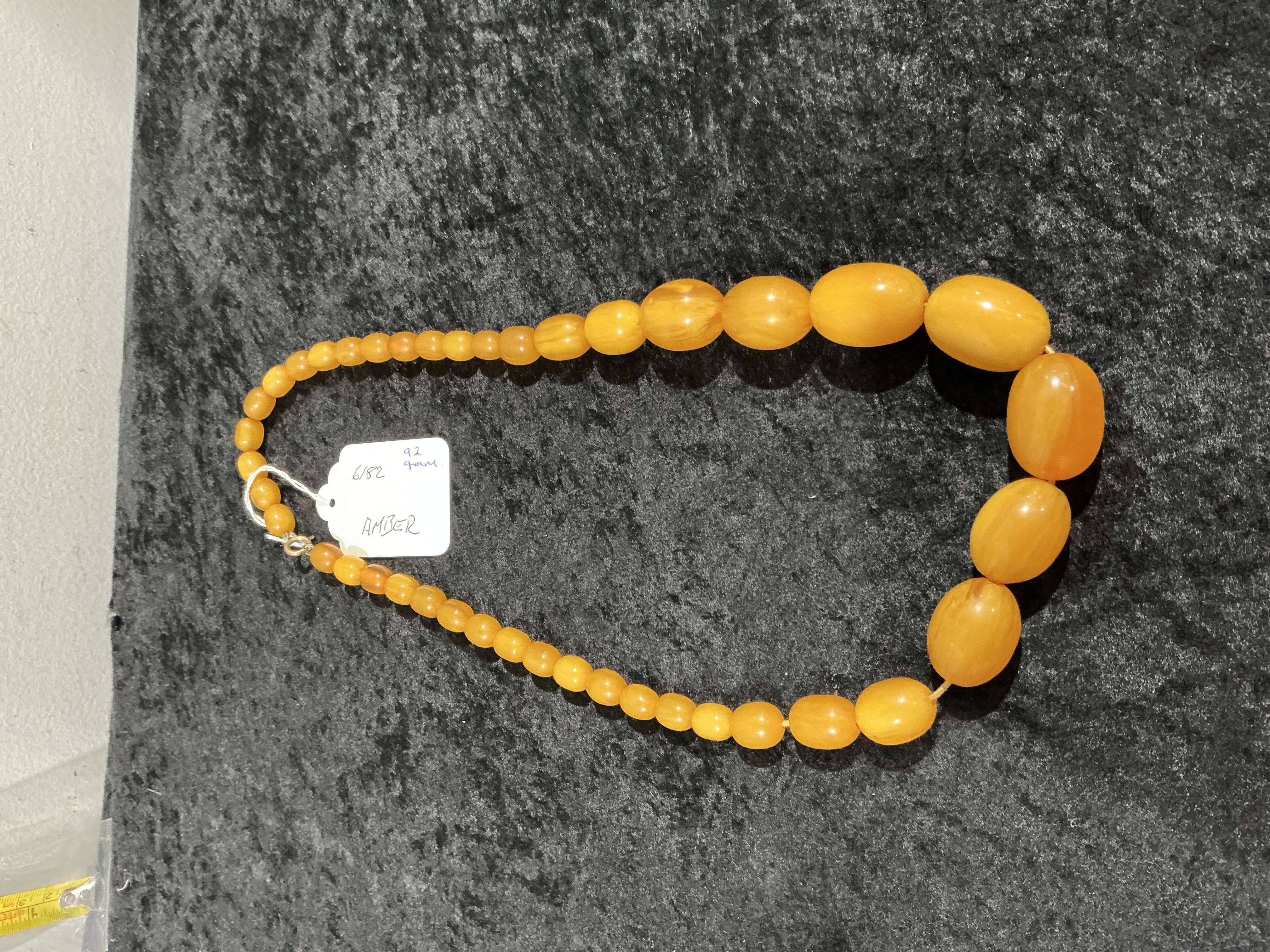The piece is in good overall condition. The amber beads appear well-preserved with no significant chips or surface abrasions. The clasp is in working order and the stringing remains intact.