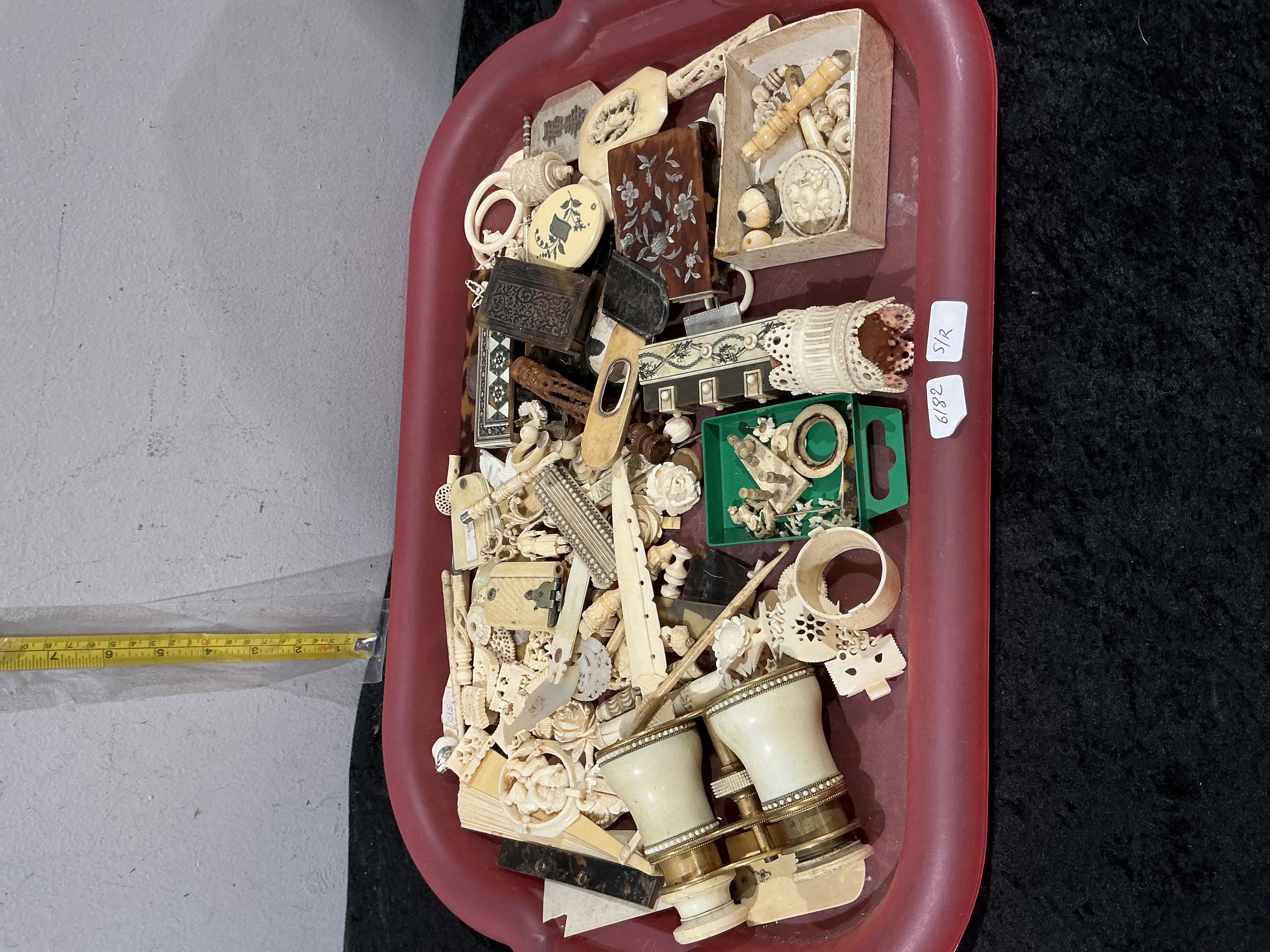 This extensive collection comprises a variety of antique and vintage decorative and functional objects, primarily constructed from carved bone, material, wood, and brass. The lot features a pair of late 19th-century opera glasses with brass fittings and polished barrels. Included is a small wooden box embellished with mother-of-pearl floral inlay. A significant portion of the lot consists of Chinese export-style carvings, including cylindrical needle cases, flat panels with intricate relief work depicting traditional scenes, and various gaming pieces. One specific panel bears Chinese characters signifying recreation or peace and happiness. The items are presented in a red plastic tray with additional components held in a green organiser and small cardboard boxes. Tray dimensions approximately 48cm by 34cm.