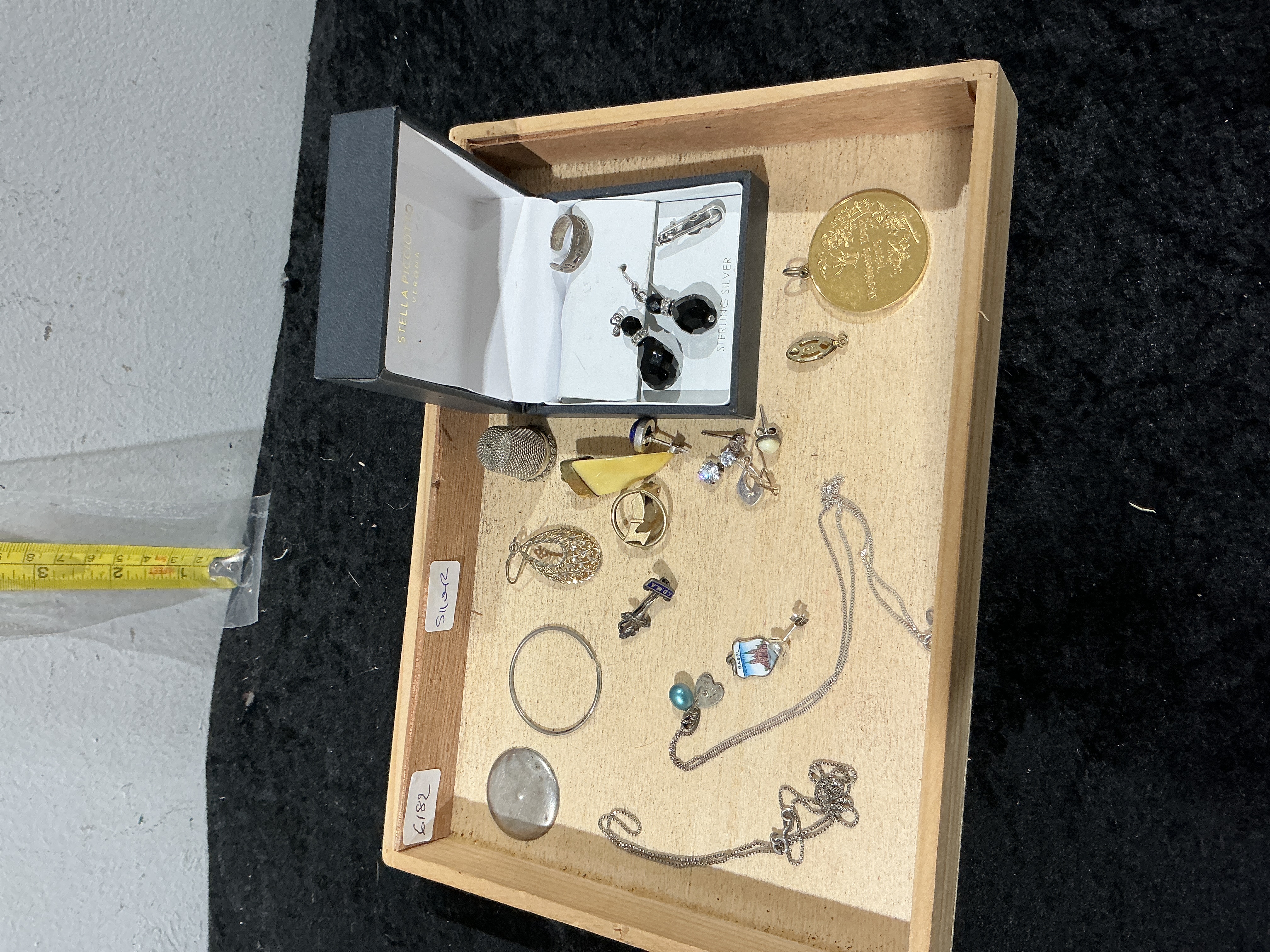 This eclectic assembly of jewellery and small objects features a mix of sterling silver. Central to the collection is a Stella Picciotto Verona presentation box containing a pair of black faceted drop earrings and a silver ring; the box insert is marked Sterling Silver. The assortment further includes a silver bangle, multiple fine link chains, and a variety of earrings featuring clear and coloured stones that appear to be paste or synthetic. engraved motifs. The collection showcases diverse craftsmanship, from openwork filigree to traditional prong settings. The wooden display tray measures approximately 25cm in width.