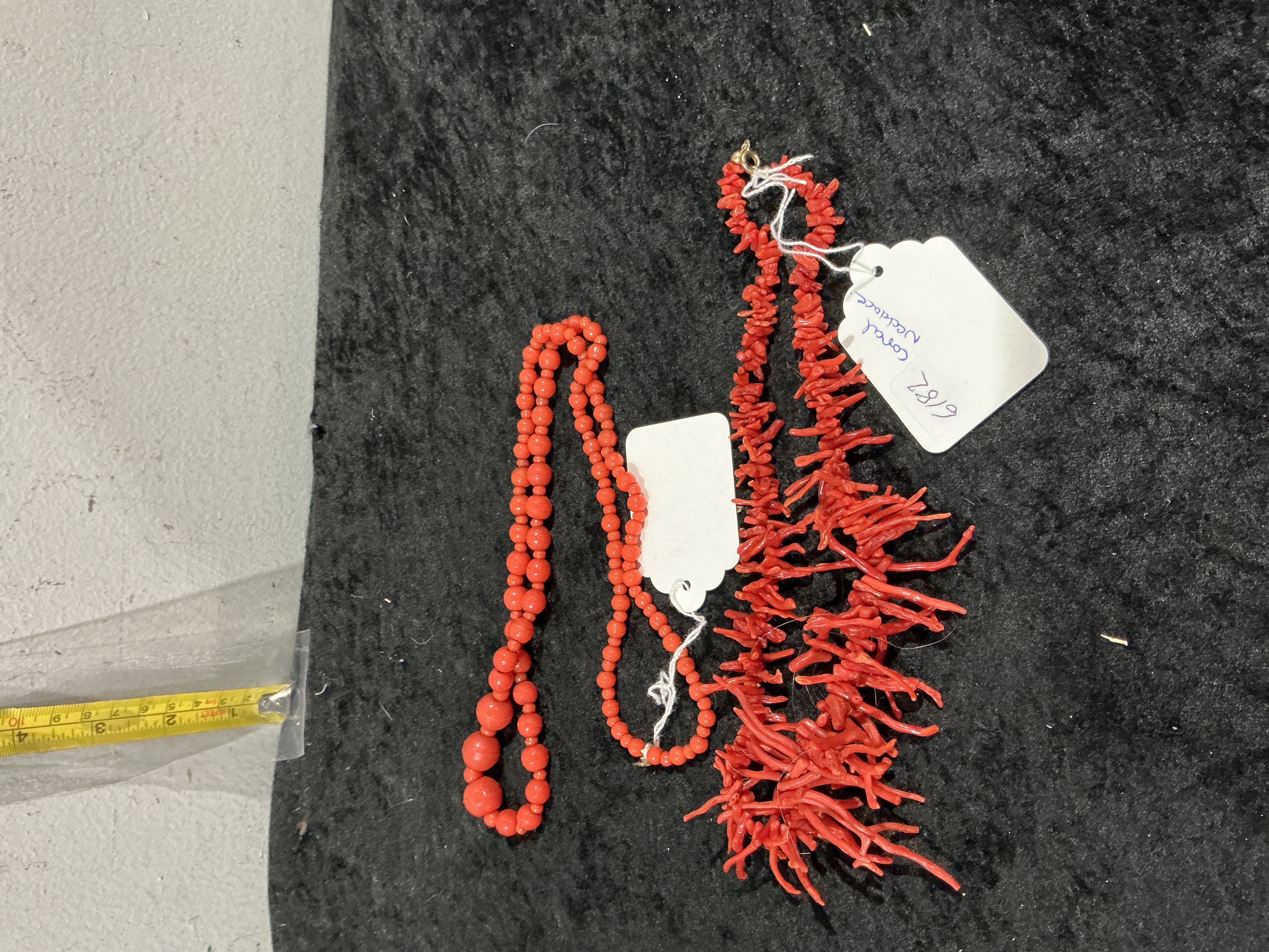This lot features two vintage necklaces in vibrant red. The first is a graduated beaded necklace consisting of a single strand of polished spherical beads that increase in size towards the centre. The second is a branch coral fringe necklace featuring natural-form red coral branches of varying lengths, secured by a gold-tone metal spring ring clasp. No hallmarks or maker marks are visible on the metal components. One necklace is accompanied by a vintage auction tag marked 6/82. Professional testing is recommended to confirm if the material is natural Mediterranean coral. Length: Approx. 45-50 cm each. Weight: Not provided.