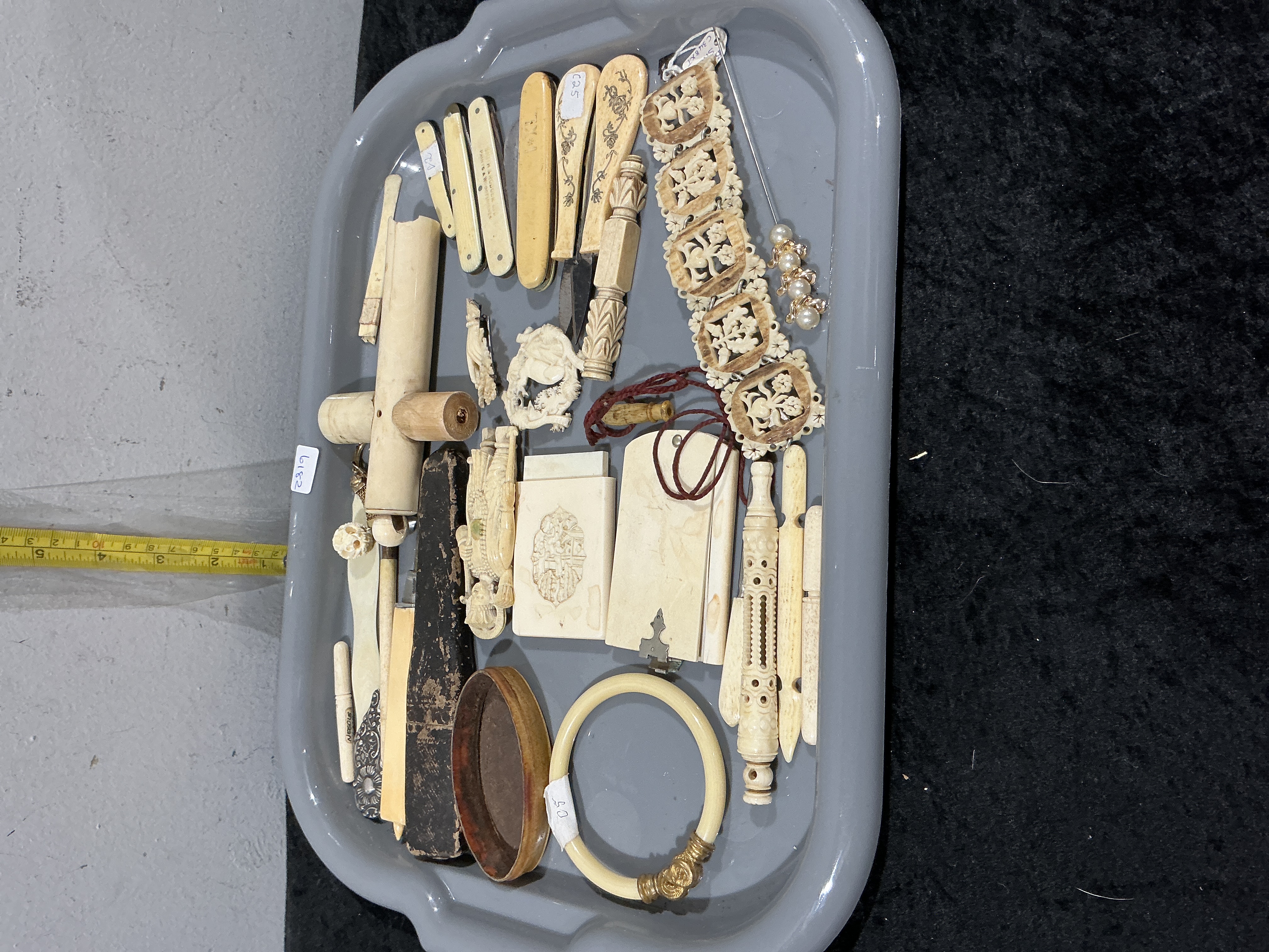 This mixed lot comprises various items crafted from carved bone material, which appears to be bone. The jewellery selection includes a rigid bangle featuring an ornate yellow-toned metal decorative mount, a wide bracelet composed of rectangular panels with intricate openwork floral carving, and a yellow-toned metal stickpin set with multiple white imitation pearls. The collection further includes several folding pocketknives with cream-coloured scales, one displaying etched floral patterns, alongside various carved figurines, a cylindrical carved needle case, and a flat case with a relief-carved crest. Construction techniques include hand-carving, metal pinning, and fitted mounts. No hallmarks or purity stamps are visible; metal components appear to be base metal or gold-plated. The items likely date from the late 19th to early 20th century and show characteristics of Chinese export craftsmanship. The rigid bangle has an approximate internal diameter of 65mm. The panel bracelet measures approximately 180mm in length. The tray width is approximately 30cm.