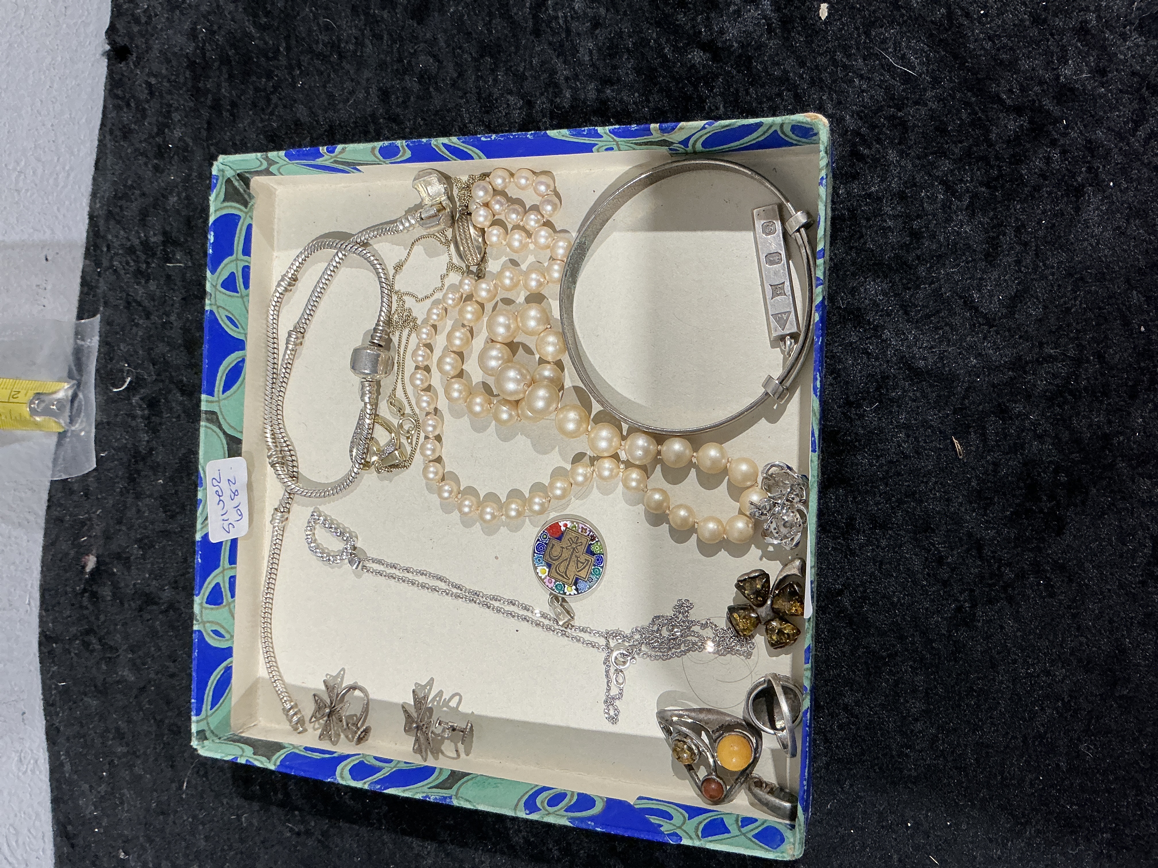 A collection of silver jewellery including a hallmarked bangle, amber-coloured stone pieces, and a pearl-style necklace