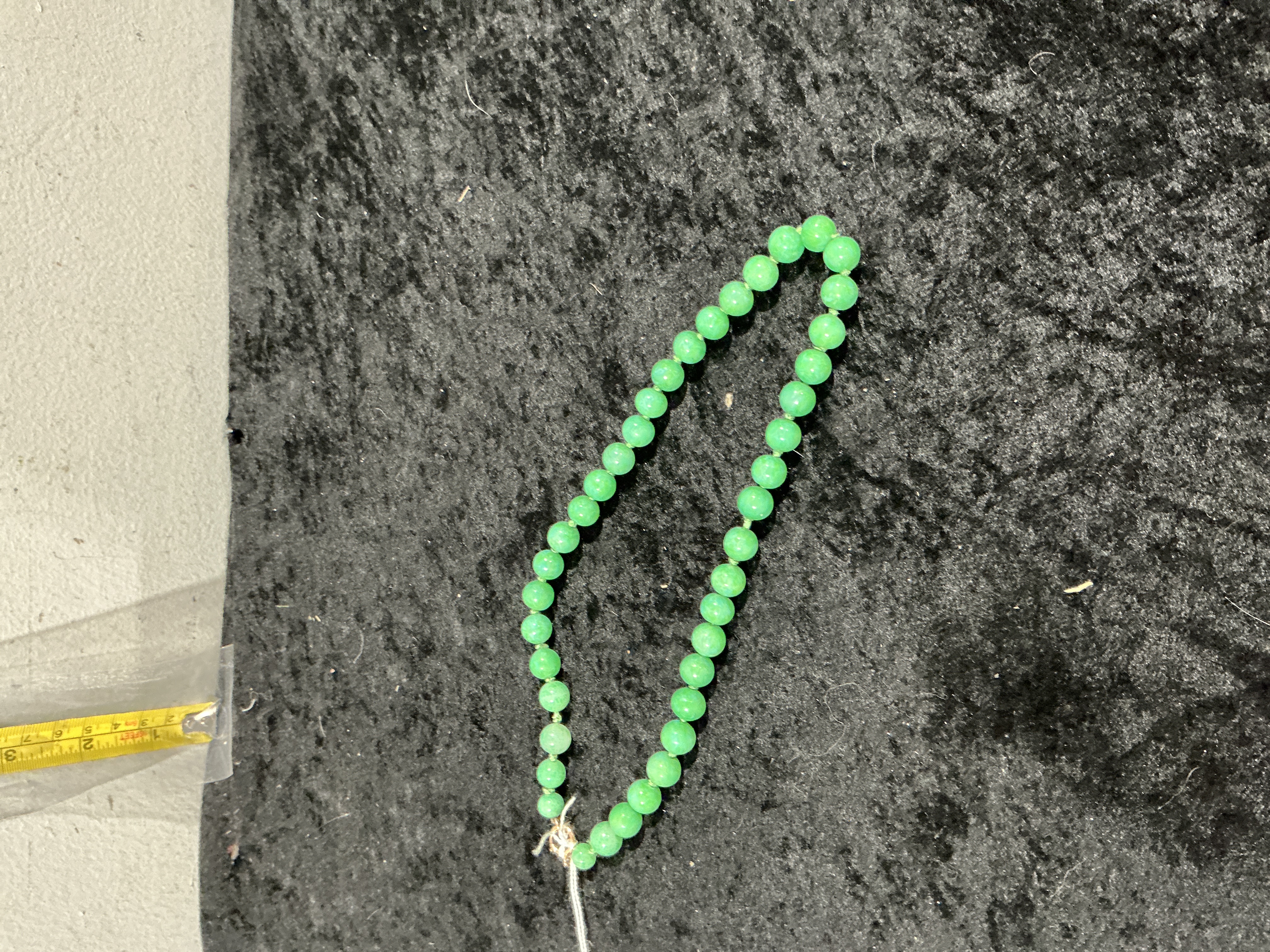 The necklace is in good condition. The beads exhibit a high lustre and consistent colour with no visible chips or fractures. The cord is intact and the knotting is secure. The clasp functions correctly.