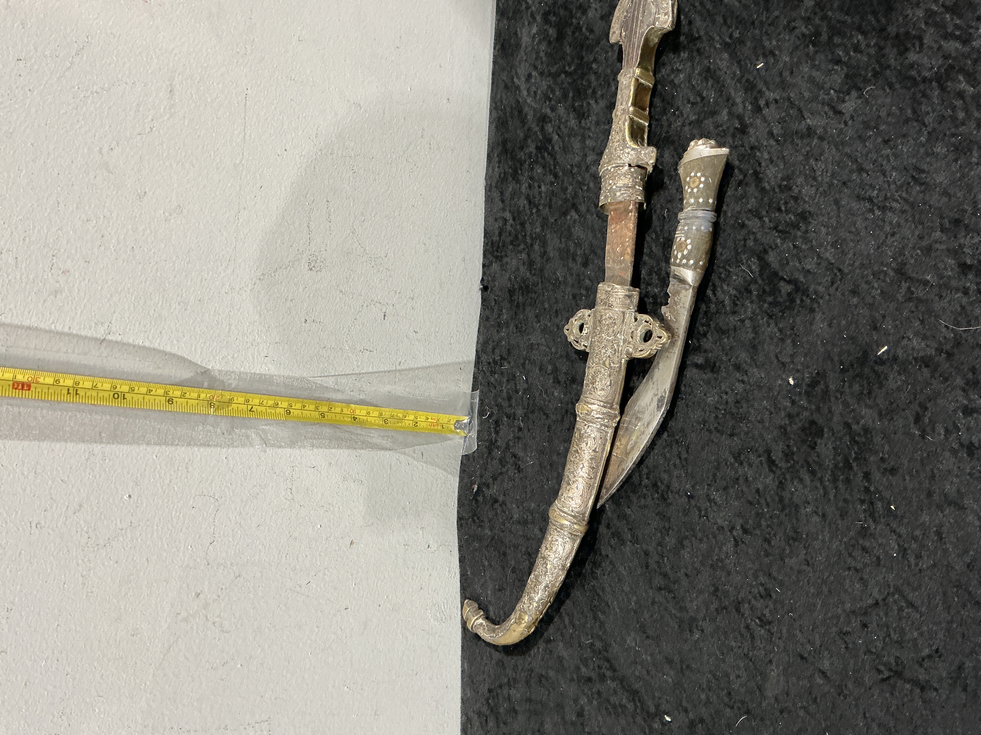 Unmarked, Moroccan Koummya and Nepalese Kukri, Silver-toned Metal and Inlaid Wood