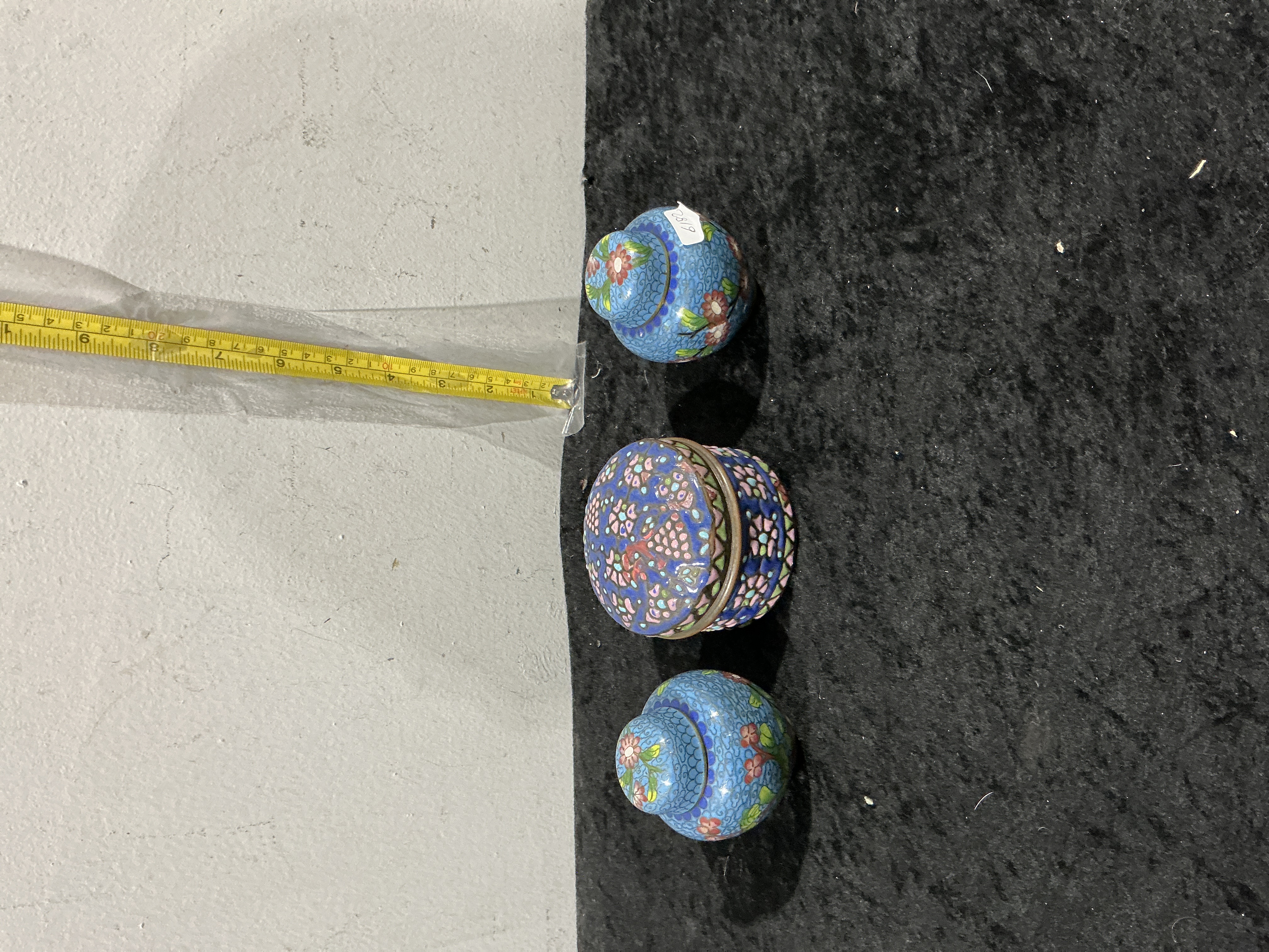 A group of three Chinese cloisonné enamel lidded vessels comprising two small ovoid-form jars and one low cylindrical box. Each piece is meticulously decorated with traditional floral and foliate patterns in a palette of pink, red, white, and green enamels. The designs are executed with fine wirework cloisons against a vibrant turquoise blue ground on a metal base, likely brass. The cylindrical box features a dense floral arrangement across the lid and body, while the ovoid jars are decorated with individual floral sprays. These pieces are characteristic of late Qing Dynasty or early Republic period export ware. Cylindrical box measures approximately 6 cm in diameter; ovoid jars measure approximately 5 cm in height.