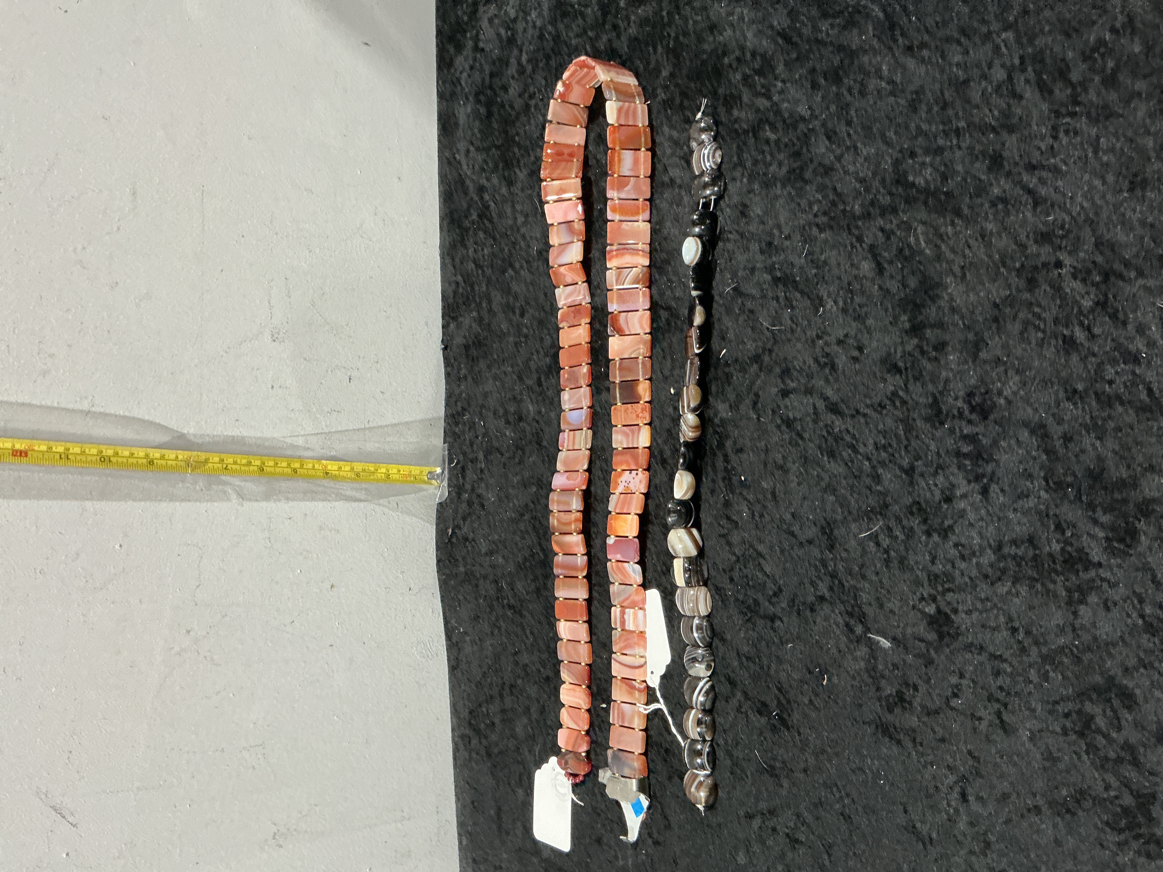 This collection features two distinct strands of banded agate jewelry. The primary piece is a long necklace composed of rectangular, flat-cut slabs of orange and reddish-pink banded agate, which appears to be carnelian. These slabs are connected by small spacers and secured with a silver-toned metal clasp. The second, shorter strand consists of rounded and irregular beads of black, white, and gray banded agate. Both pieces showcase natural banding and color variations characteristic of the agate family. No hallmarks or maker’s marks are present; the metal components appear to be silver-toned metal. The longer necklace measures approximately 34 inches in total length.