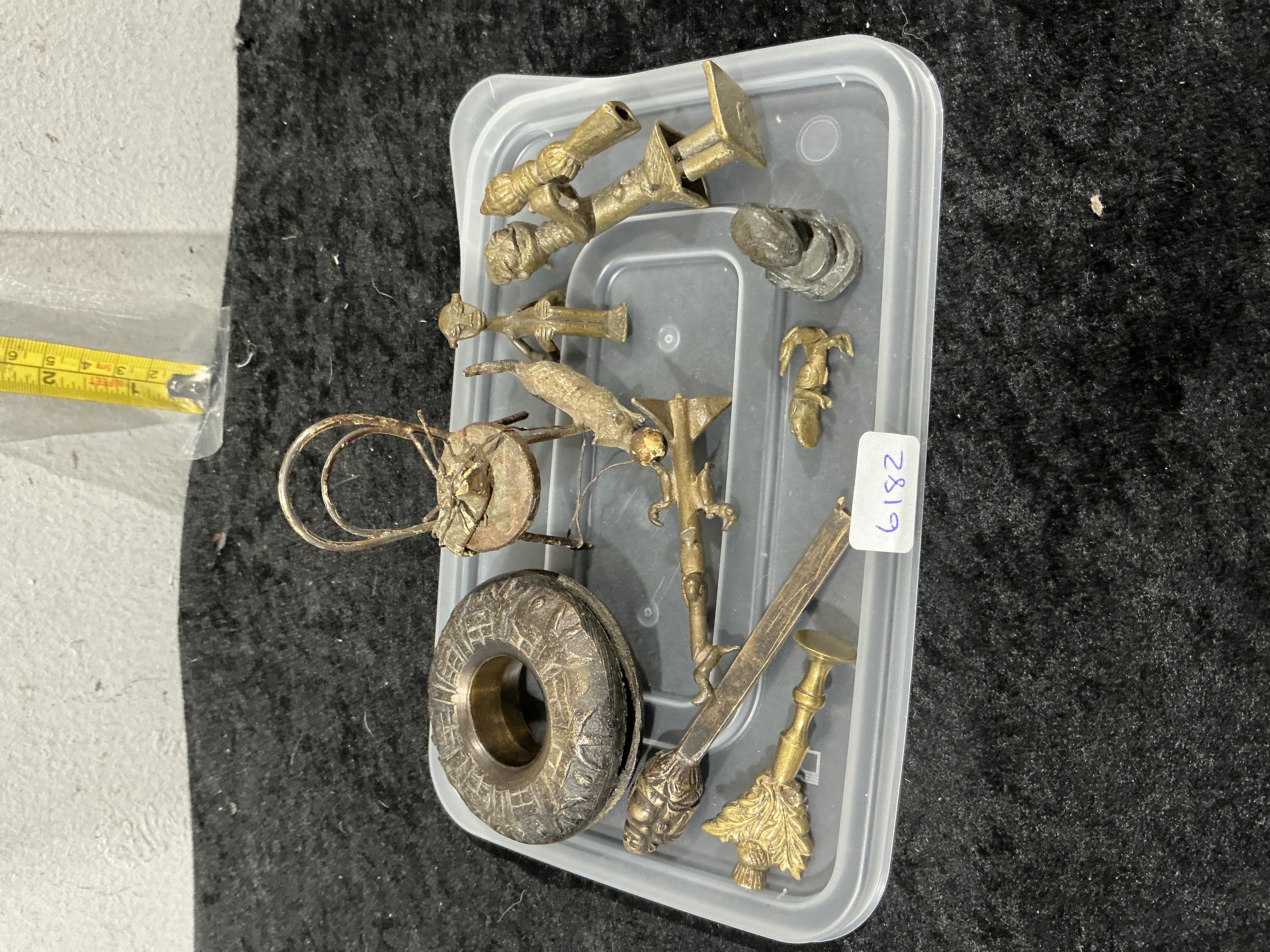 This lot comprises a collection of small, cast metal objects primarily of West African origin, accompanied by miscellaneous decorative brass pieces. The ethnographic items exhibit stylistic characteristics of the Akan people of Ghana and Ivory Coast, specifically the Ashanti goldweights known as mrammuo. The group includes several stylized human and animal figurines, a miniature stool, and a large ring featuring incised geometric patterns. These pieces are produced using the traditional lost-wax (cire perdue) casting method. Also included are various cast metal fragments and European or colonial-style decorative hardware, such as a thistle-shaped element, which appear to be sand-cast or die-cast. The collection likely dates to the 20th century, containing a mix of older traditional weights and more recent souvenir or decorative productions. An inventory label numbered 6182 is present on the tray.