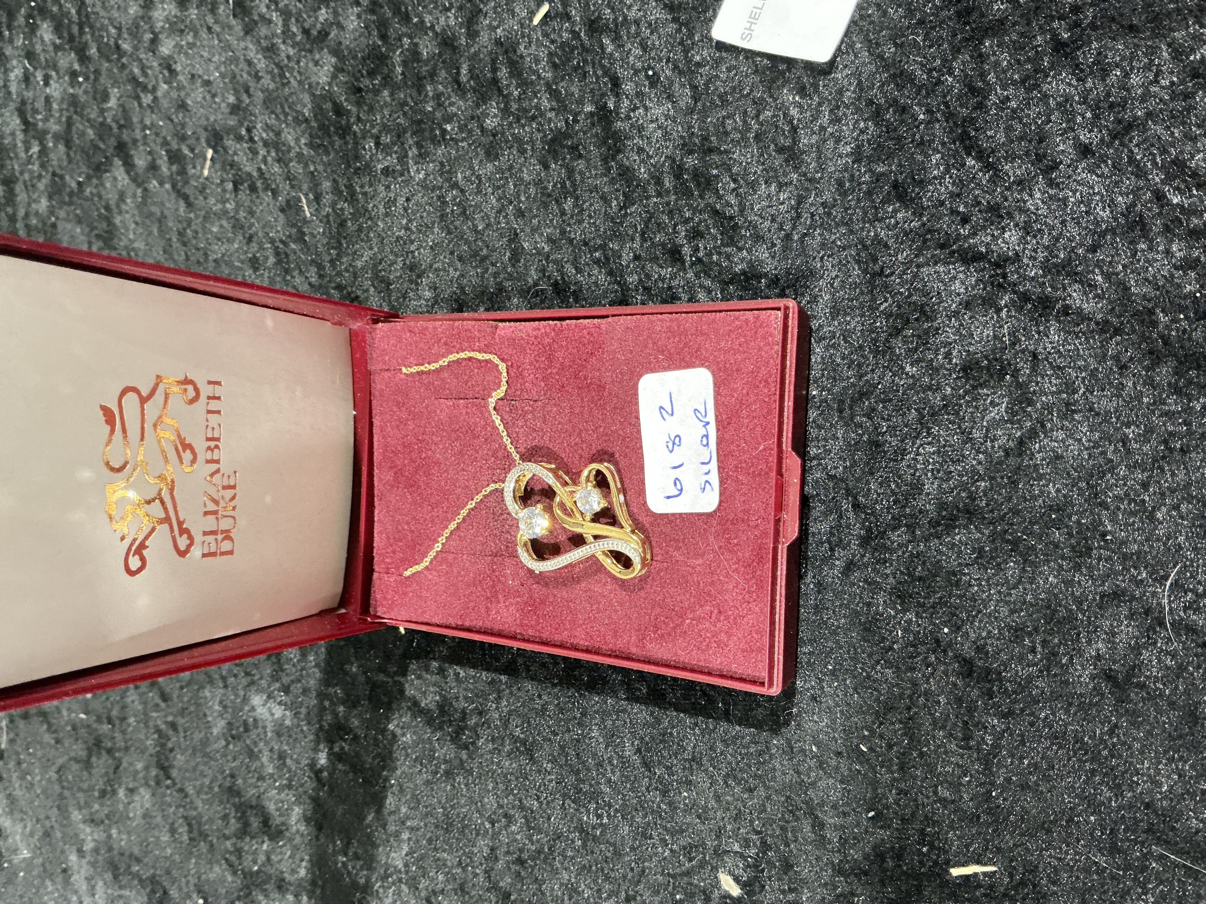 A yellow-toned metal pendant necklace, likely gold-plated sterling silver as indicated by the handwritten label on the box. The necklace features a fine trace chain and a detachable pendant. The pendant is designed as a stylized, intertwined double-heart motif, accented with two larger round-cut clear stones and a partial border of small, pavé-set clear accent stones. The item is presented in its original Elizabeth Duke branded box. No hallmarks are visible on the piece. Length: Not measured. Weight: Not measured.