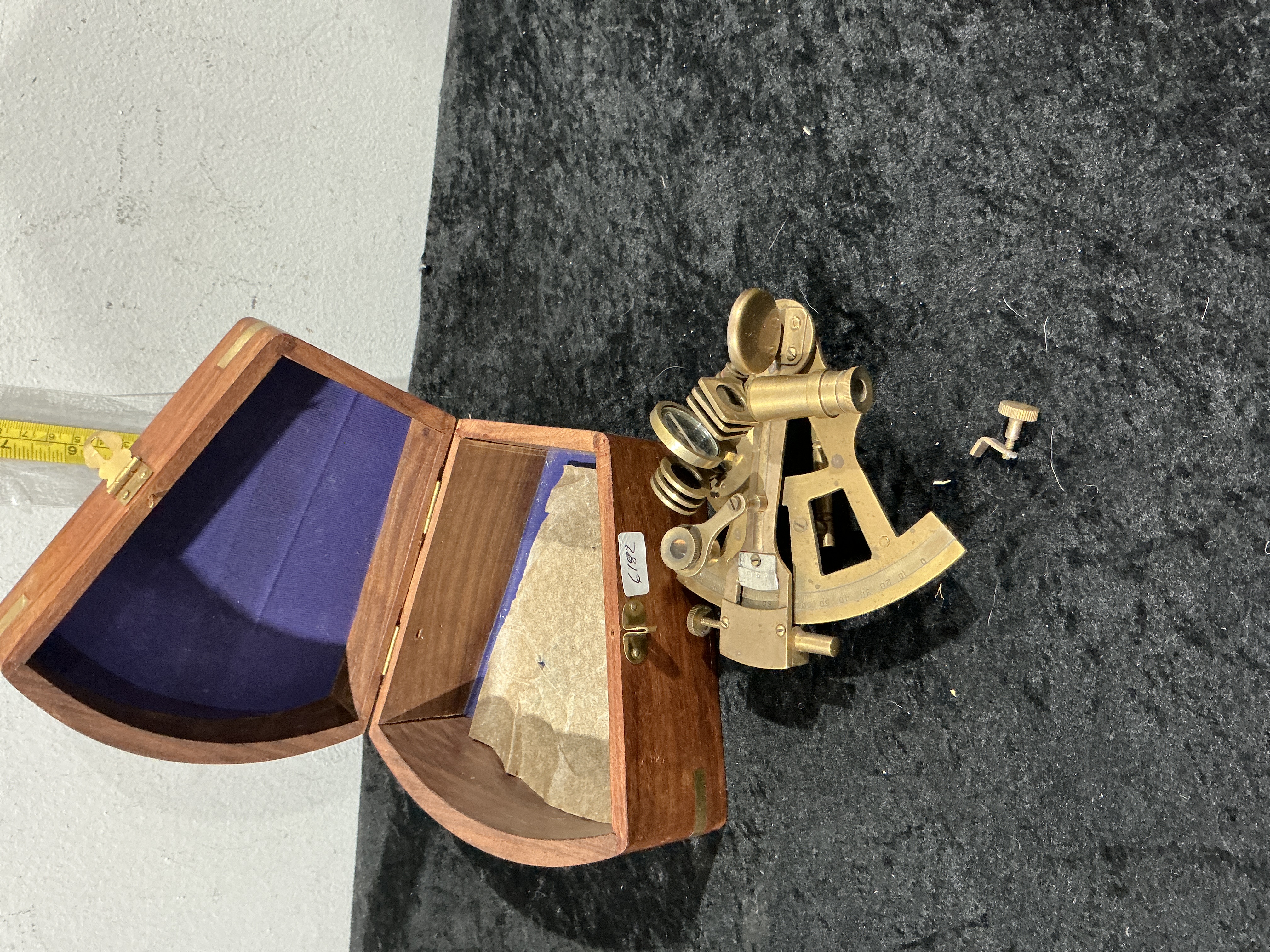 A polished brass marine sextant featuring an unidentified maker’s mark on a silver-toned plate attached to the index arm. The instrument is constructed from solid brass with glass lenses and mirrors. It features a graduated arc scale ranging from 0 to 120 degrees. The sextant is housed in its original custom-fitted hardwood case, likely mahogany, which is lined with purple felt and secured with brass hinges and a front latch. The box currently bears a small inventory label numbered 6182. This piece represents a classic nautical navigational tool, likely produced as a functional decorative item in the late 20th century.