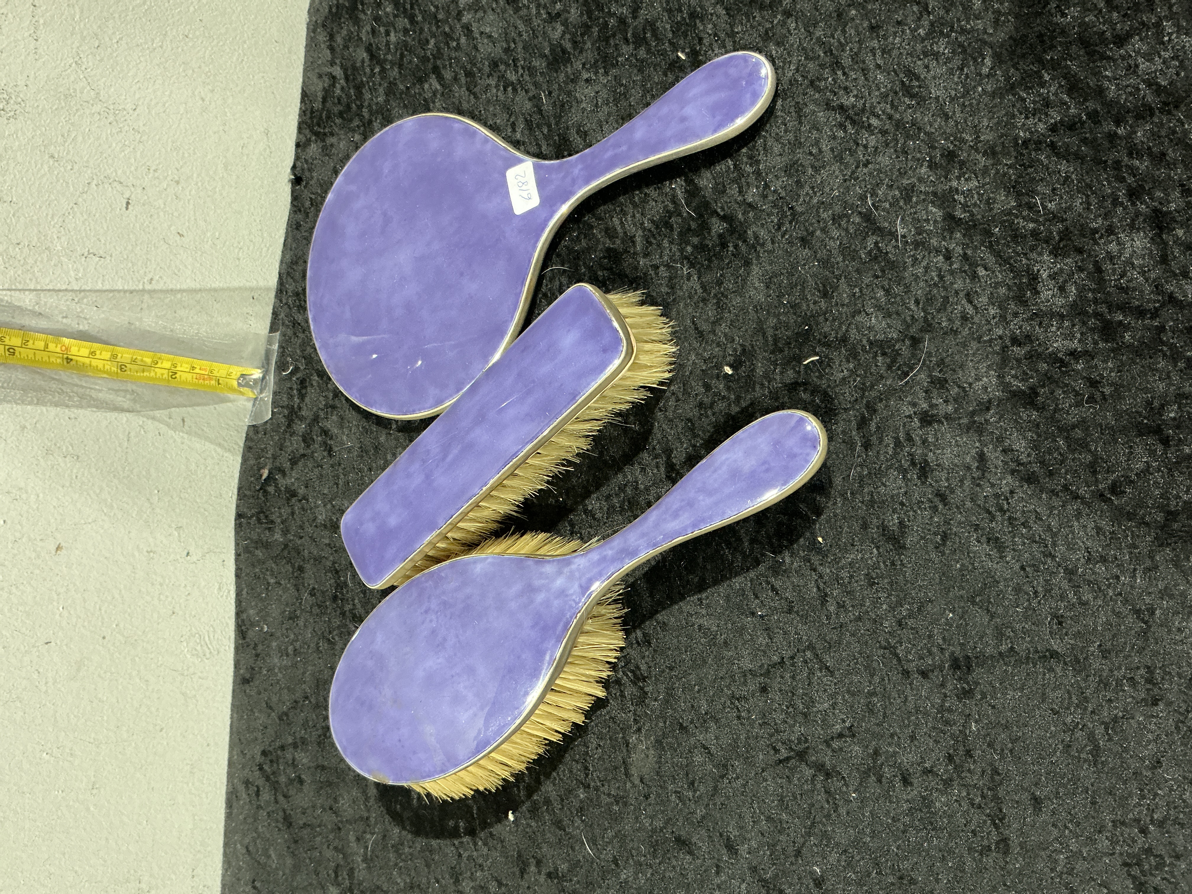The set is presented in good vintage condition. There are minor surface scratches and faint signs of wear to the enamel consistent with age and use. The silver plated components exhibit light tarnish but remain structurally sound. The bristles on both brushes appear well-maintained and intact.