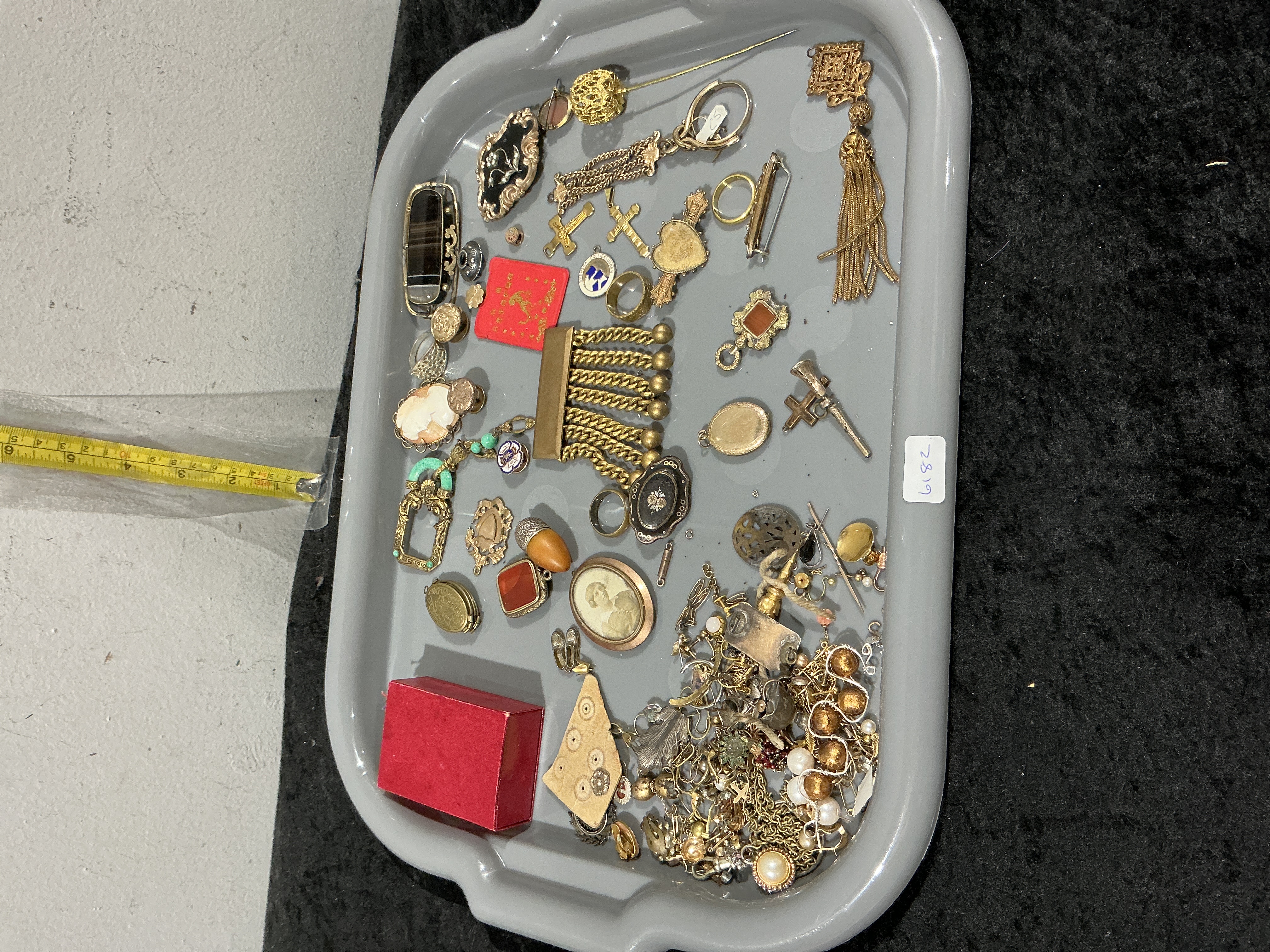 A diverse assortment of gold-toned and silver-toned costume jewellery and miscellaneous items. The collection features several shell cameos in various sizes, a large Victorian-style tassel brooch with articulated chain drops, and various items featuring black and white enamel decoration. Stones appear to include carnelian, agate, and onyx cabochons, alongside imitation pearls and glass accents. Construction techniques include filigree work, bezel settings, and wirework. Notable items include an acorn-shaped charm, multiple cross pendants, and various stickpins. No hallmarks or maker’s marks are visible; the metal appears to be base metal with gold or silver-coloured plating. The lot includes a small red jewellery box. Weight not provided. Tray measures approximately 30 cm in length.