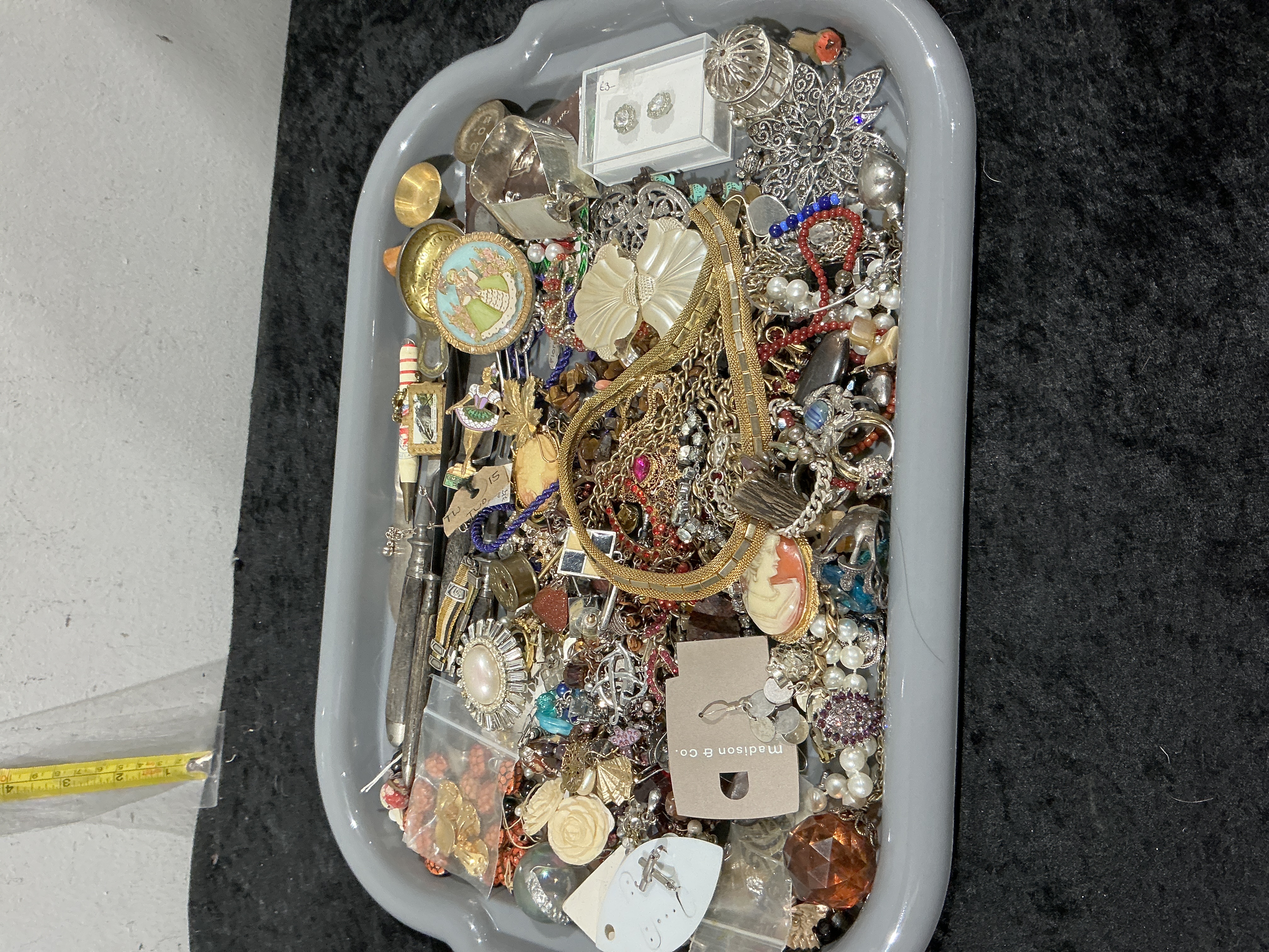A diverse and extensive collection of vintage and contemporary costume jewellery and small decorative objects. The lot features a variety of necklaces, including heavy yellow gold-tone flat-link chains, multi-strand beaded necklaces, and several strings of imitation pearls. A notable selection of brooches is included, featuring carved shell cameos, mother-of-pearl floral motifs, and various enamelled and figurative designs. The collection further comprises an array of bracelets, rings, and earrings, with some items retained on original retail cards by Madison & Co. or within presentation boxes. Metals appear predominantly as yellow gold-tone and silver-tone base metals with plating; however, some pieces may test as precious metals upon individual inspection. Decorative elements include faceted glass and synthetic stones in a wide spectrum of colours, alongside resin and enamel work. Also present are a silver-toned thimble and a decorative handled letter opener. Various hallmarks and maker’s marks are present across the collection. Tray measures approximately 40cm by 30cm.