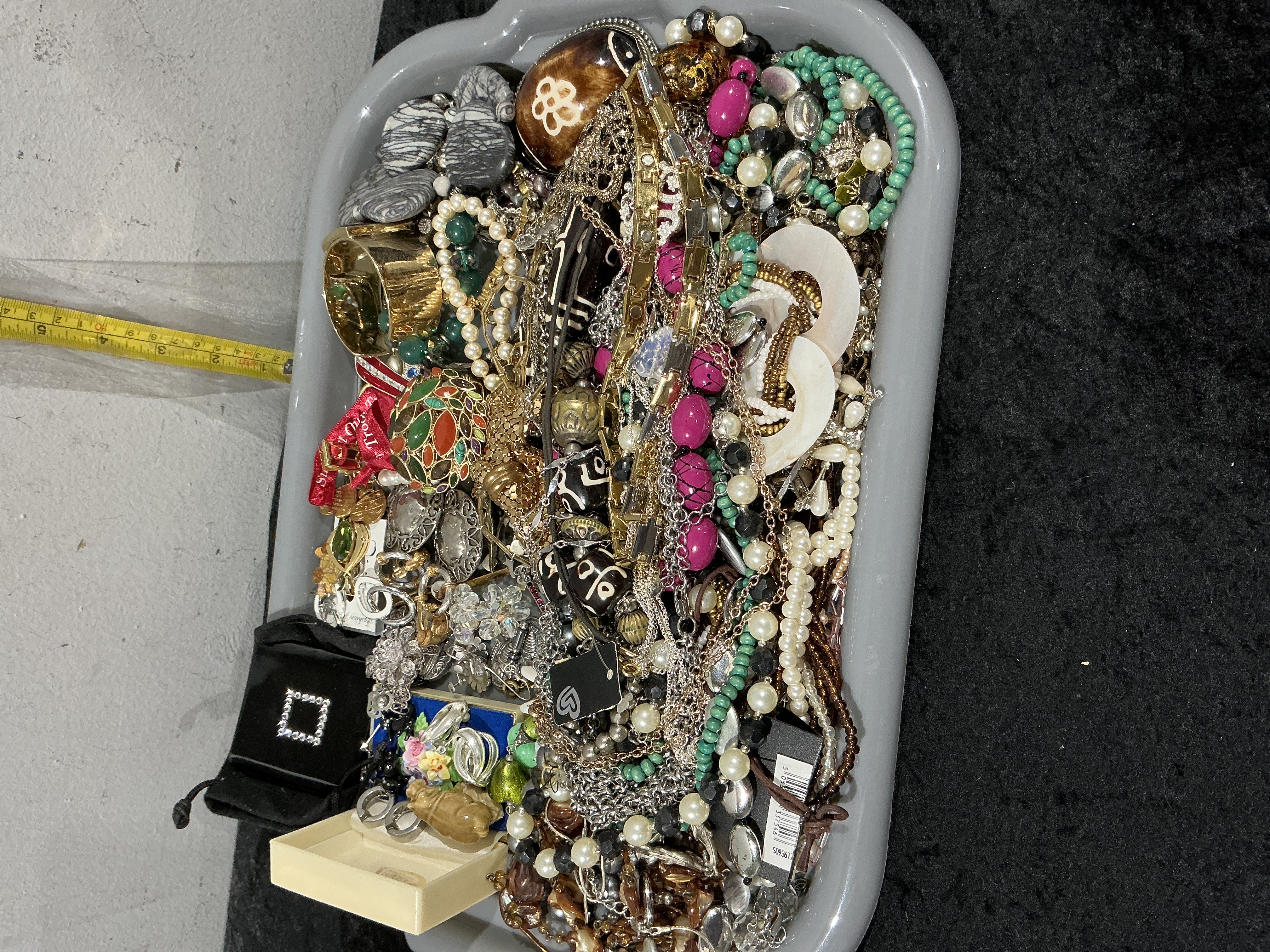 A comprehensive collection of assorted costume jewellery presented in a grey plastic tray. The lot comprises a diverse range of items including necklaces, bracelets, earrings, rings, and brooches. Materials include yellow-tone, silver-tone, and base metals, decorated with faux pearls of varying sizes, turquoise-coloured beads, vibrant fuchsia beads, shell components, and organic materials such as bone and wood. Notable items include a wide gold-tone cuff bracelet, various multi-strand beaded necklaces, and a black velvet drawstring pouch featuring a pavé-set crystal square ornament. Construction techniques range from simple bead stringing to more complex chain-link designs and enamelled accents. No specific hallmarks, purity stamps, or maker’s marks are legible from the visual overview. Some items retain original retail tags. The grey plastic tray measures approximately 45 cm in length.