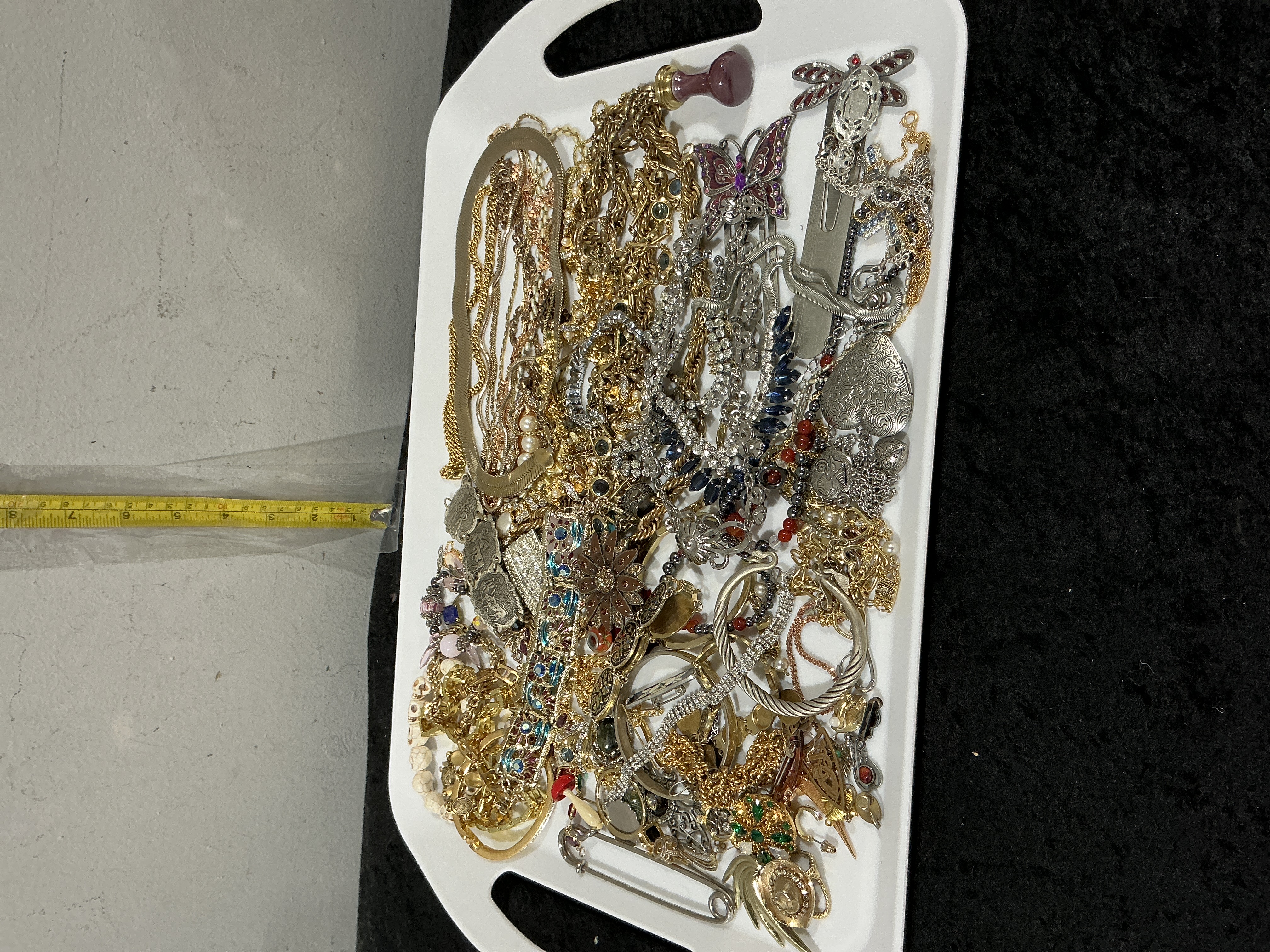 This comprehensive estate collection comprises a diverse assortment of vintage costume jewellery presented in various yellow and silver-tone base metals. The lot features a variety of necklaces, including rope and herringbone link styles, alongside an array of bracelets and decorative pins. Notable pieces include brooches with enamel butterfly and dragonfly motifs, as well as items accented with what appear to be simulated pearls, red beads, and multi-coloured rhinestones in clear, blue, and red hues. Construction techniques observed include metal casting, prong-setting, and pavé-set accents. No hallmarks, purity stamps, or maker’s marks were identified upon visual inspection. The collection represents a broad range of mid-to-late 20th-century decorative styles. Tray measures approximately 25 cm in width.