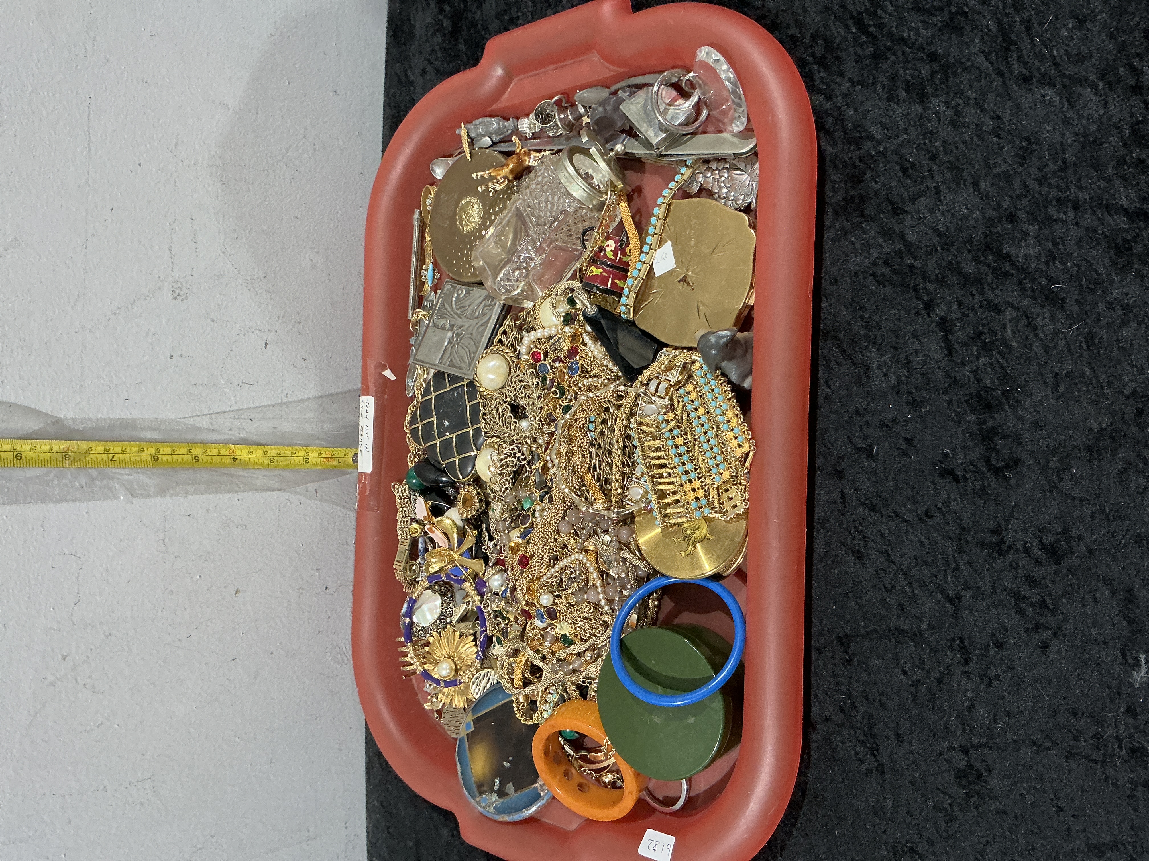 A comprehensive collection of assorted vintage costume jewellery and personal accessories presented in a bulk lot. The assembly features a variety of necklaces, bracelets, brooches, and rings, primarily constructed from yellow gold-tone and silver-tone base metals. Decorative elements include imitation pearls, turquoise-coloured beads, and an array of multi-coloured faceted synthetic or glass stones in various settings. The lot also contains several resin or plastic bangles in vibrant blue, orange, and green, alongside polished yellow-metal vanity compacts and a small glass vessel. Construction techniques range from intricate chain links to stamped metalwork. No visible hallmarks or maker’s marks were identified during the initial inspection. The tray measures approximately 35 cm in length.