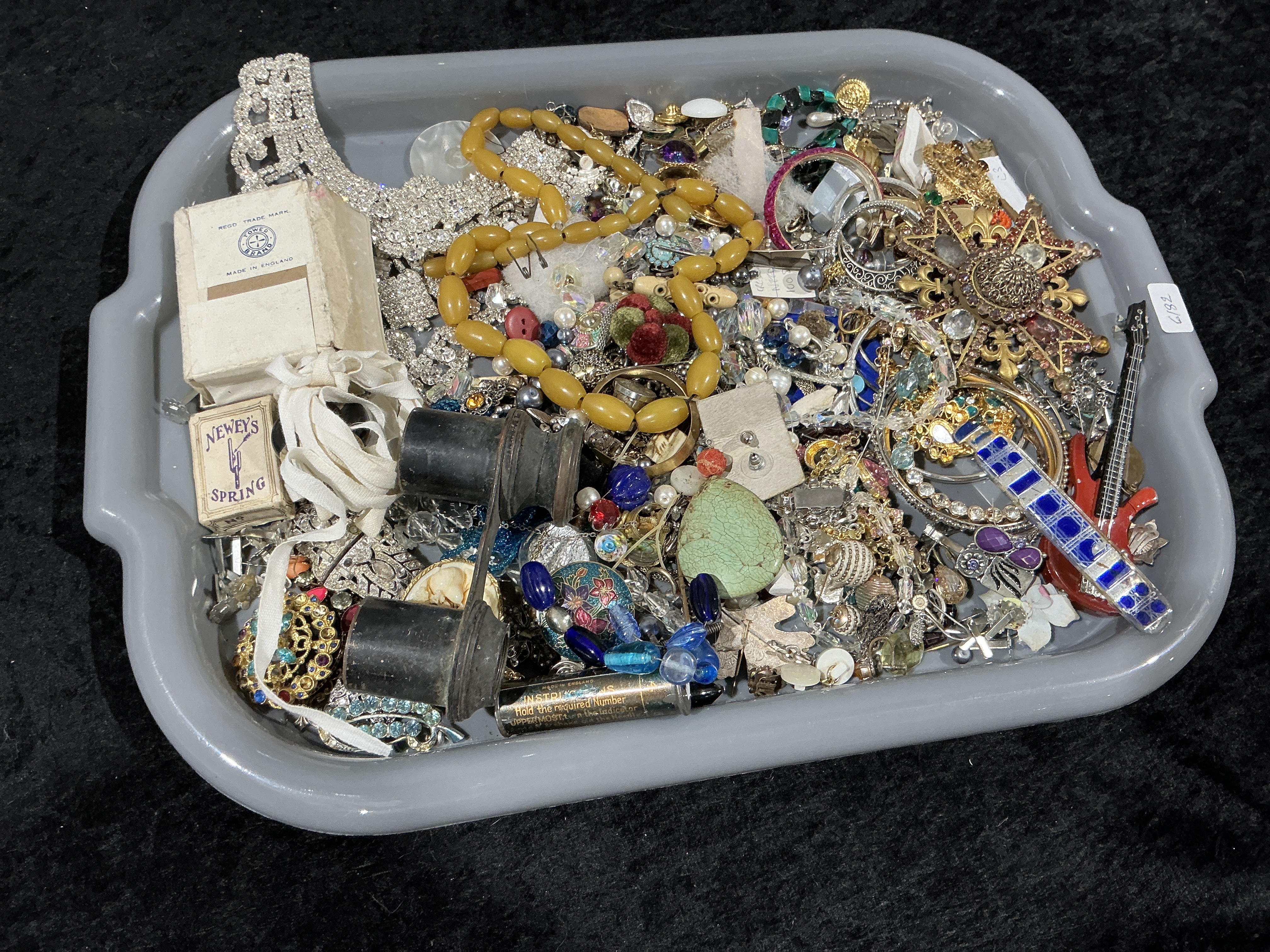 A comprehensive bulk collection of vintage and modern costume jewellery and small estate curiosities. The lot features an assortment of gold-tone and silver-tone base metal items, including a prominent strand of large, oval, amber-coloured beads, and various necklaces, bracelets, rings, and earrings. Notable pieces include a large ornate gold-tone cross brooch set with red glass rhinestones, a red enamel guitar-shaped pin, and various items featuring prong-set and glued multi-coloured glass accents. The collection is interspersed with non-jewellery collectibles, including a pair of vintage black opera glasses, a large green egg-shaped composite object, and period packaging for Tower Brand and Newey’s Spring products. No precious metal hallmarks or maker’s marks were observed during initial inspection. Weight and measurements not recorded.
