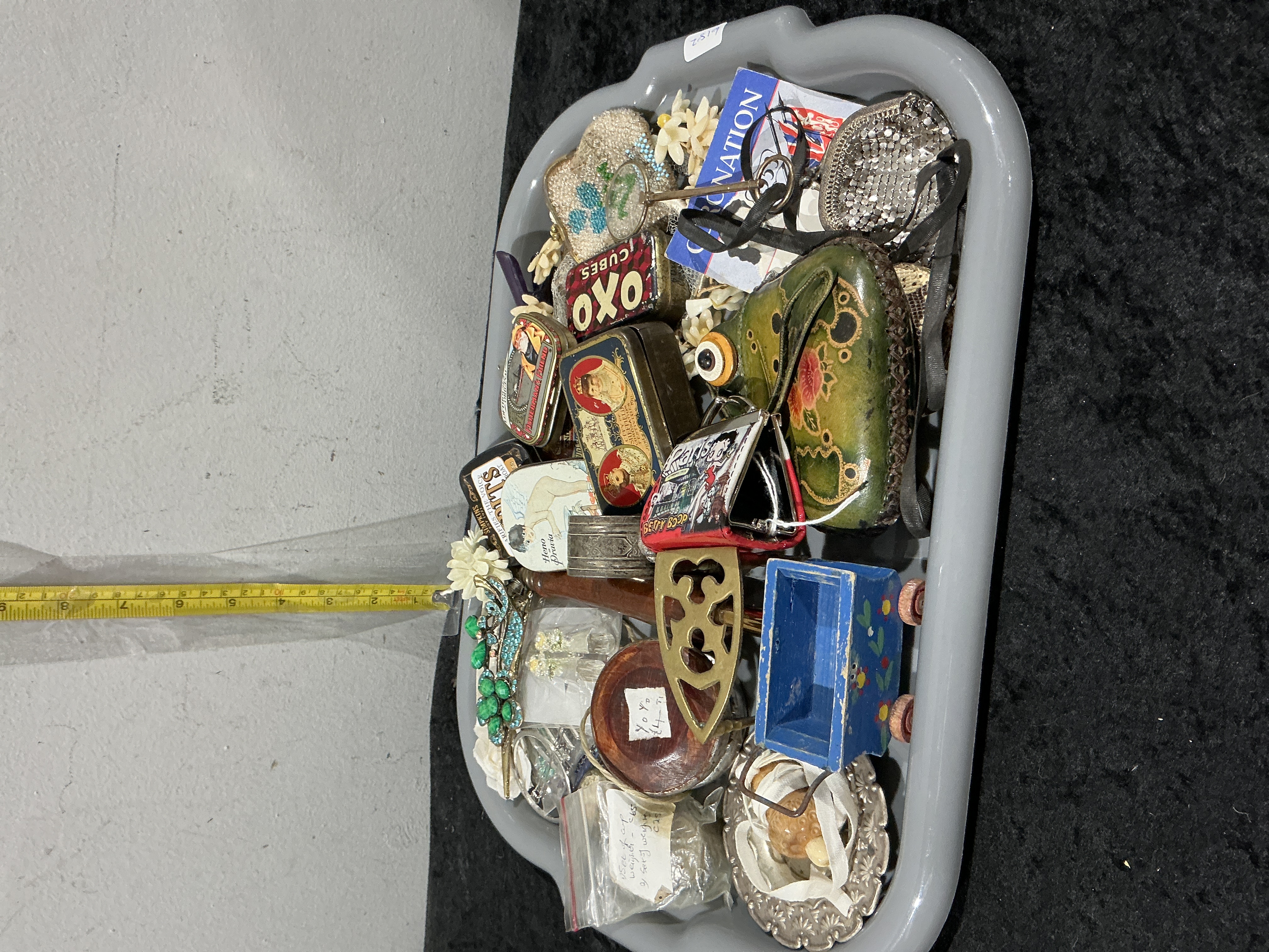 A diverse collection of vintage and decorative items presented in a grey plastic tray. The lot features several notable lithographed advertising tins, including a classic red OXO Cubes container and a figurative tin marked Hono Praia. Significant ephemera includes a 1953 Coronation commemorative card. The assortment of costume jewellery comprises a substantial green and blue stone brooch and a delicate beaded mesh purse. Additional items of interest include a green floral-patterned leather pouch, a small blue hand-painted wooden toy cart, and a circular wooden yoyo bearing a handwritten price label. The collection is rounded out by a Betty Boop themed accessory, an ornate silver-toned dish, and a decorative brass-toned metal element. Materials range from lithographed tin and wood to leather, glass, and base metals. Tray width approximately 25.5 cm (10 inches).