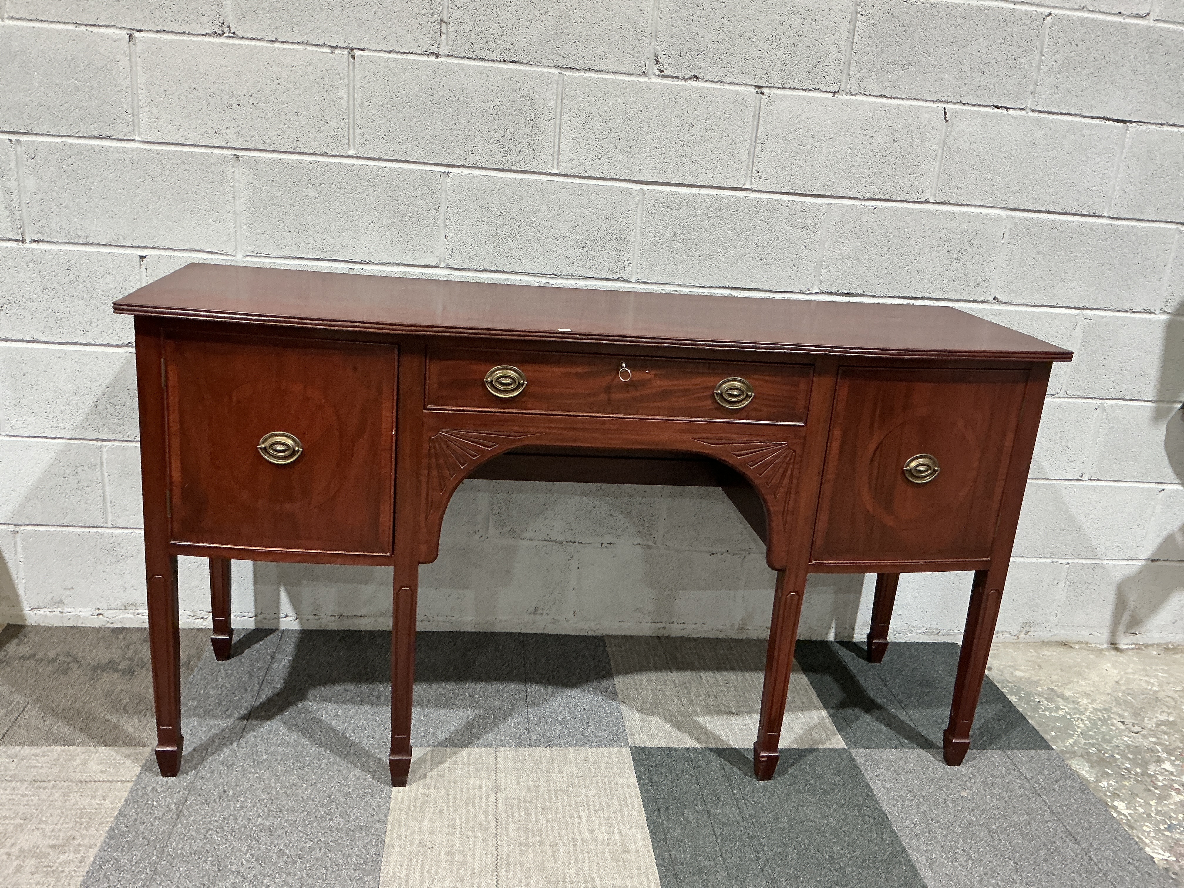 A fine 20th-century mahogany sideboard in the Hepplewhite or Federal style, featuring a rectangular top with a moulded edge. The configuration comprises a central frieze drawer above a recessed kneehole, flanked by two cupboard doors. The doors are embellished with circular marquetry inlay panels, while the kneehole area is framed by decorative carved fan-shaped spandrels. The piece is constructed with rich reddish-brown mahogany veneers over a secondary wood frame. It is raised on four square tapered legs terminating in traditional spade feet. The sideboard retains its original hardware, consisting of four oval brass swing handles with embossed backplates. Although no maker’s label is present, the construction and design are characteristic of high-quality mid-century manufacturers specialising in period reproductions. Dimensions: H 91 cm x W 152 cm x D 51 cm.