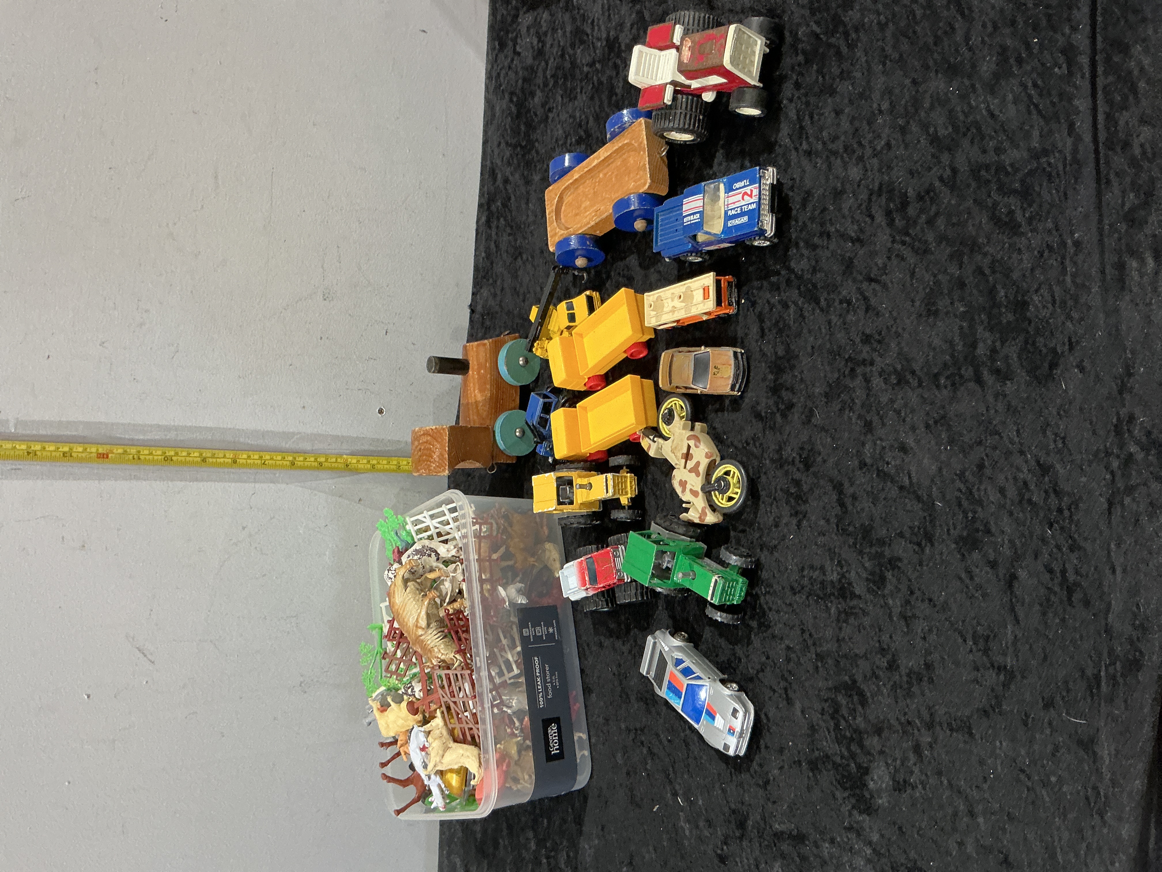 A diverse collection of vintage and modern toys, primarily featuring die-cast metal and plastic vehicles from renowned manufacturers such as Tonka, Matchbox, and Hot Wheels. The assortment includes a blue Race Team truck featuring TURBO and CHAMPION decals, a silver sports car, and a fleet of yellow construction vehicles comprising dump trucks and a front-end loader. Also present is a green tractor, a motorcycle with a sidecar finished in a tan camouflage pattern, and a red and white tractor. The lot is further complemented by two traditional wooden toys: a block-style locomotive with green wheels and a matching trailer with blue wheels. Included is a clear plastic George Home storage container filled with a variety of plastic farm and wild animals, alongside miniature fencing components. These items represent a broad cross-section of late 20th-century playthings, characterised by their durable construction and varied subject matter. The collection measures approximately 45 cm in total width as displayed.