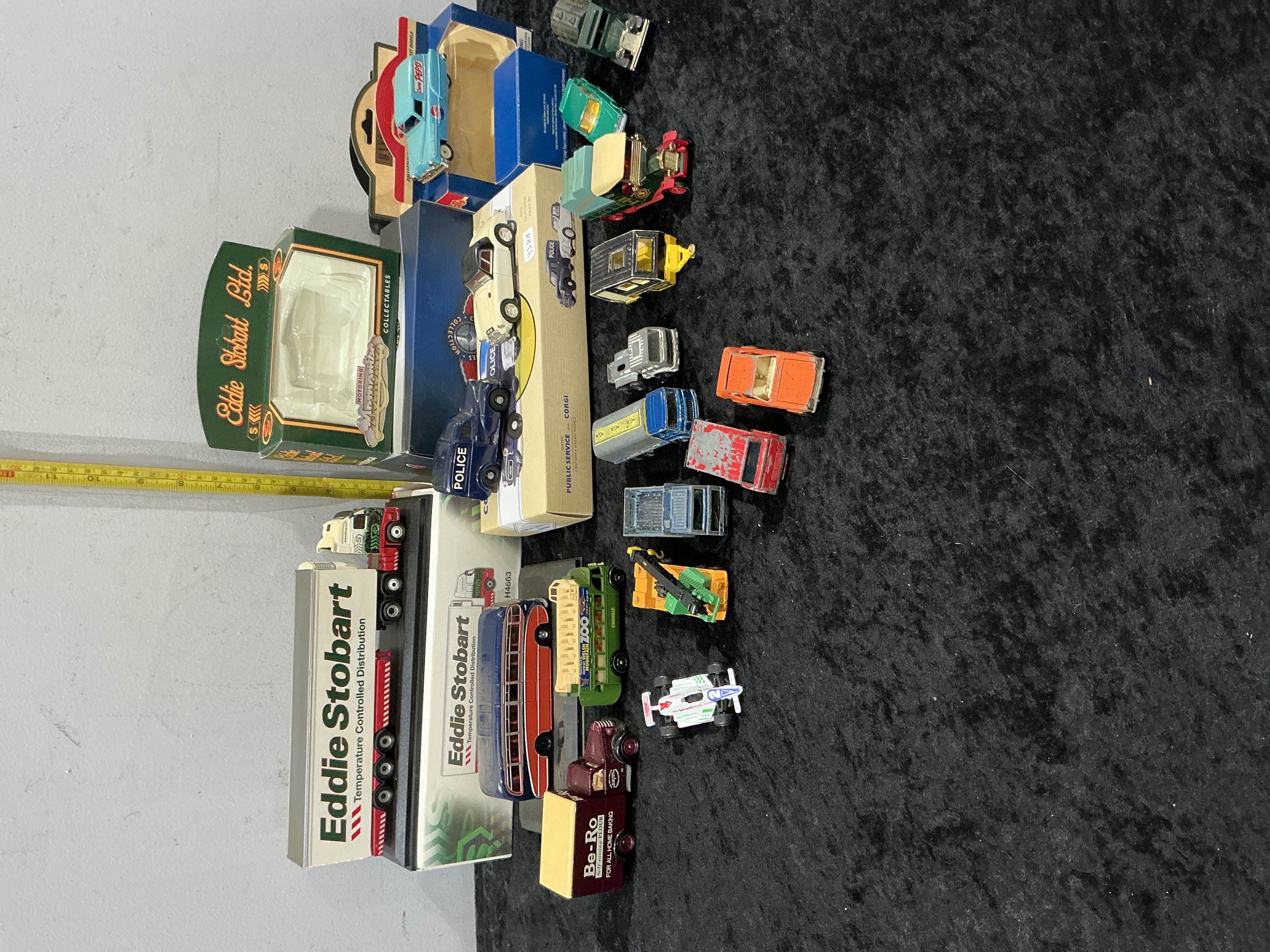 A diverse collection of die-cast metal vehicles featuring prominent manufacturers Corgi and Atlas Editions. The lot includes several boxed examples: an Atlas Editions 1/76 scale Eddie Stobart articulated lorry in Temperature Controlled Distribution livery, a Corgi Motoring Memories Eddie Stobart truck, a Corgi Public Service set containing a police car, and a Matchbox Pepsi delivery truck. The collection is supplemented by a variety of loose models, including a London Zoo bus, a Be-Ro delivery truck, a double-decker bus, a police van, a crane truck, and several cars including an orange sports car and a racing car. These models feature authentic liveries and period-accurate branding.