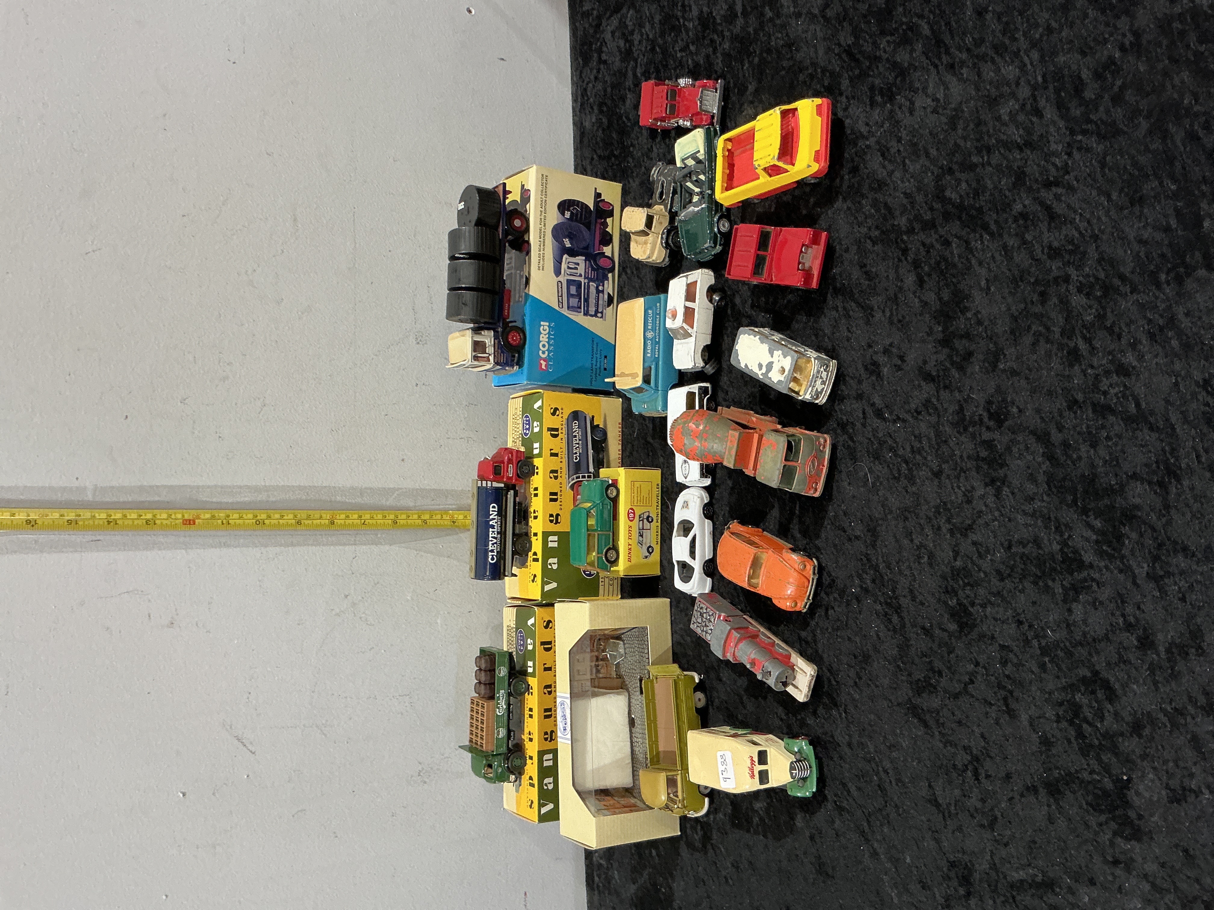 A diverse collection of die-cast metal model vehicles featuring prominent manufacturers including Corgi Classics, Dinky Toys, Vanguards (Lledo), and Lesney Matchbox. The assembly comprises both original boxed examples and loose vintage play-worn models. Boxed items include a Corgi Classics large-scale commercial truck in Cleveland livery, two Vanguards models consisting of a Cleveland fuel tanker and a Carlsberg beer barrel flatbed truck, and a Lledo Days Gone Kellogg’s promotional delivery van. A notable highlight is the Dinky Toys No. 197 Morris Mini-Traveller, presented in its original yellow pictorial card box. The loose assortment, identified by web consensus as primarily Lesney Matchbox productions, includes approximately 12 vehicles such as an orange Volkswagen Beetle, a cement mixer, a white police car, a blue Radio Rescue van, a red fire engine, and a red and grey steam locomotive. The models are constructed from die-cast metal with various plastic components for windows, tyres, and interior detailing.
