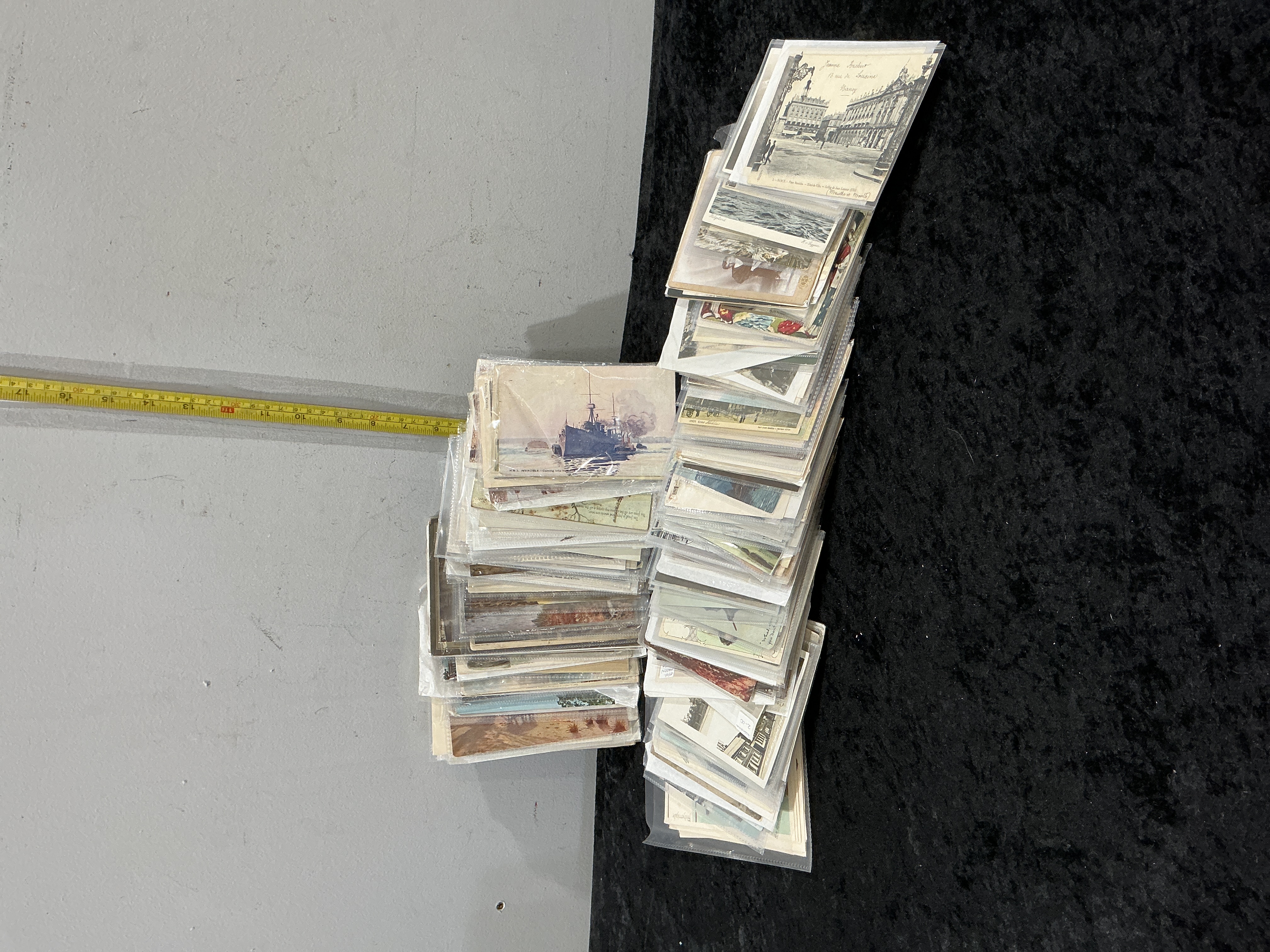 This substantial collection comprises 200 various age postcards featuring a diverse array of themes dating from the early 1900s through to the mid-20th century. The lot includes a significant variety of topographical, maritime, and illustrative subjects. Notable examples include a topographical view of a historic square in Nancy, France, published by Veuve Barber, 12 rue de Serre, Nancy, and a maritime card depicting a dreadnought-style battleship at sea. The collection encompasses the Edwardian era and the Golden Age of postcards, with subjects ranging from natural landscapes and coastal seascapes to sentimental illustrative art. The cards represent a mix of printing techniques, including lithography and potentially real photo postcards. Many items retain their original manuscript correspondence and period postage stamps on the reverse, providing historical context and philatelic interest. Dimensions: Each approximately 140mm x 90mm.