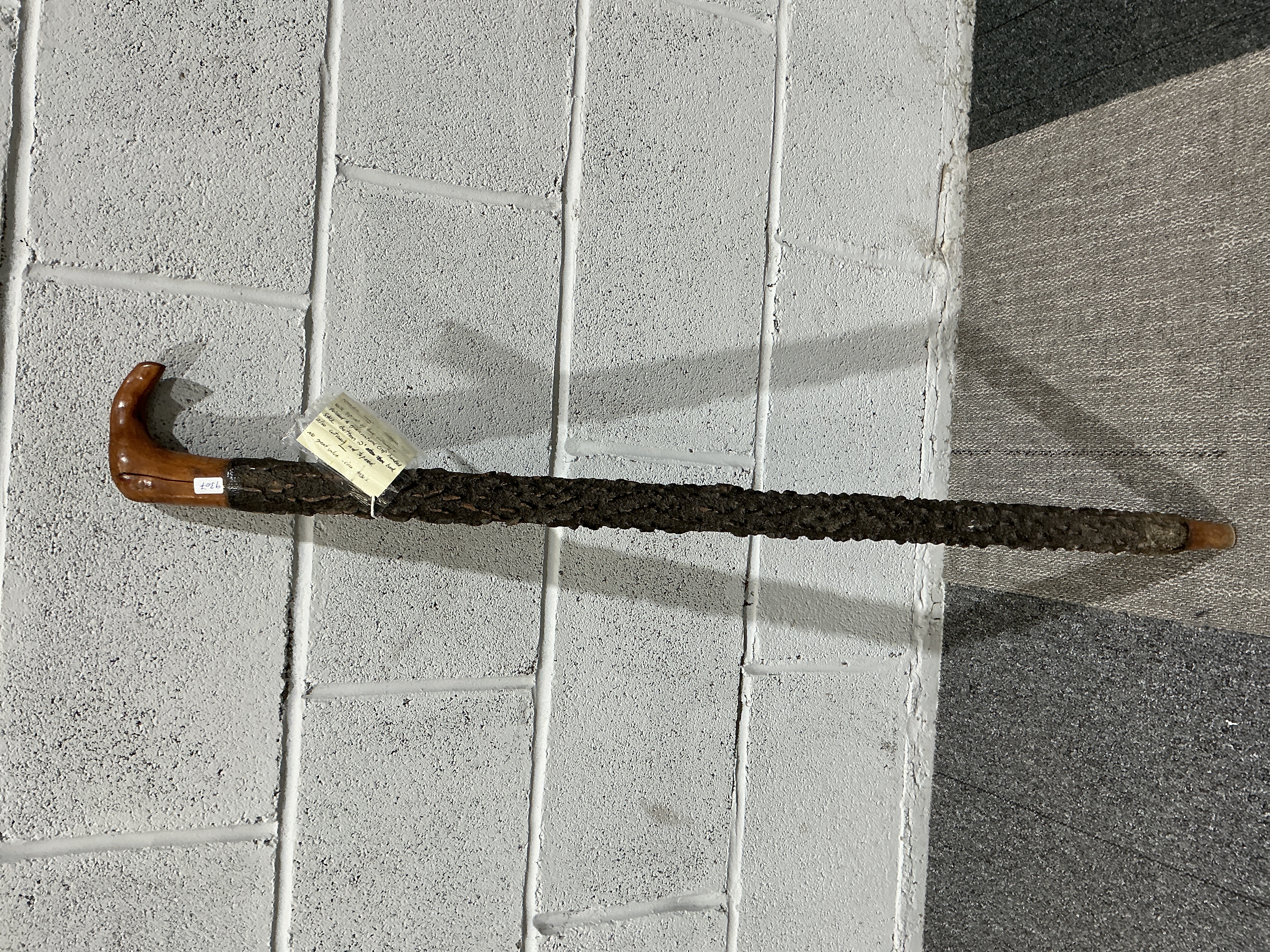 A rustic one-piece Irish blackthorn walking stick of substantial form, dating to the early 20th century. The integral crop-style handle is fashioned from the uppermost section of the branch, stripped and polished to a smooth honey-coloured finish to highlight the natural wood grain. The shaft is characterised by its thick, craggy, and deeply textured dark brown bark, left in its natural state. The stick features a natural wood ferrule formed by stripping and tapering the bottom section of the branch to a point. This is a solid walking stick with no hidden system features, hallmarks, or metal fittings. It retains a small inventory sticker and a handwritten descriptive tag. Length 31in.
