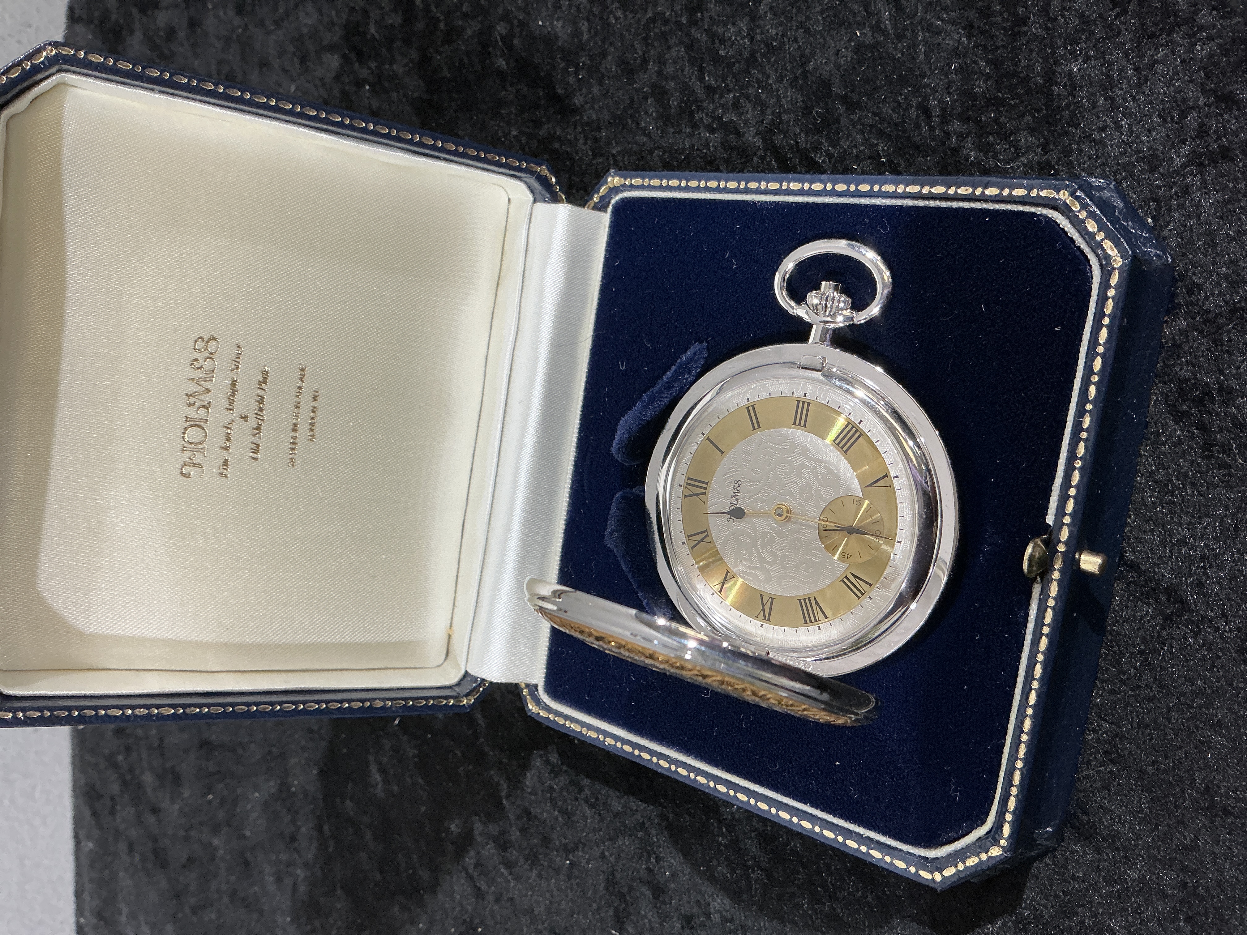Brand: Holmes & Co. Model: Hunter Case Pocket Watch. Reference: N/A. Movement: Manual winding crown-set movement. Case: Polished sterling silver hunter case. Dial: Two-tone dial with engine-turned silver centre, floral motifs, gold-toned chapter ring, Roman numerals, and sub-seconds at 3 o’clock. Bracelet: N/A. Serial: Not visible. Box/Papers: Original Holmes & Co. retailer’s presentation box included. Case size: 48mm.