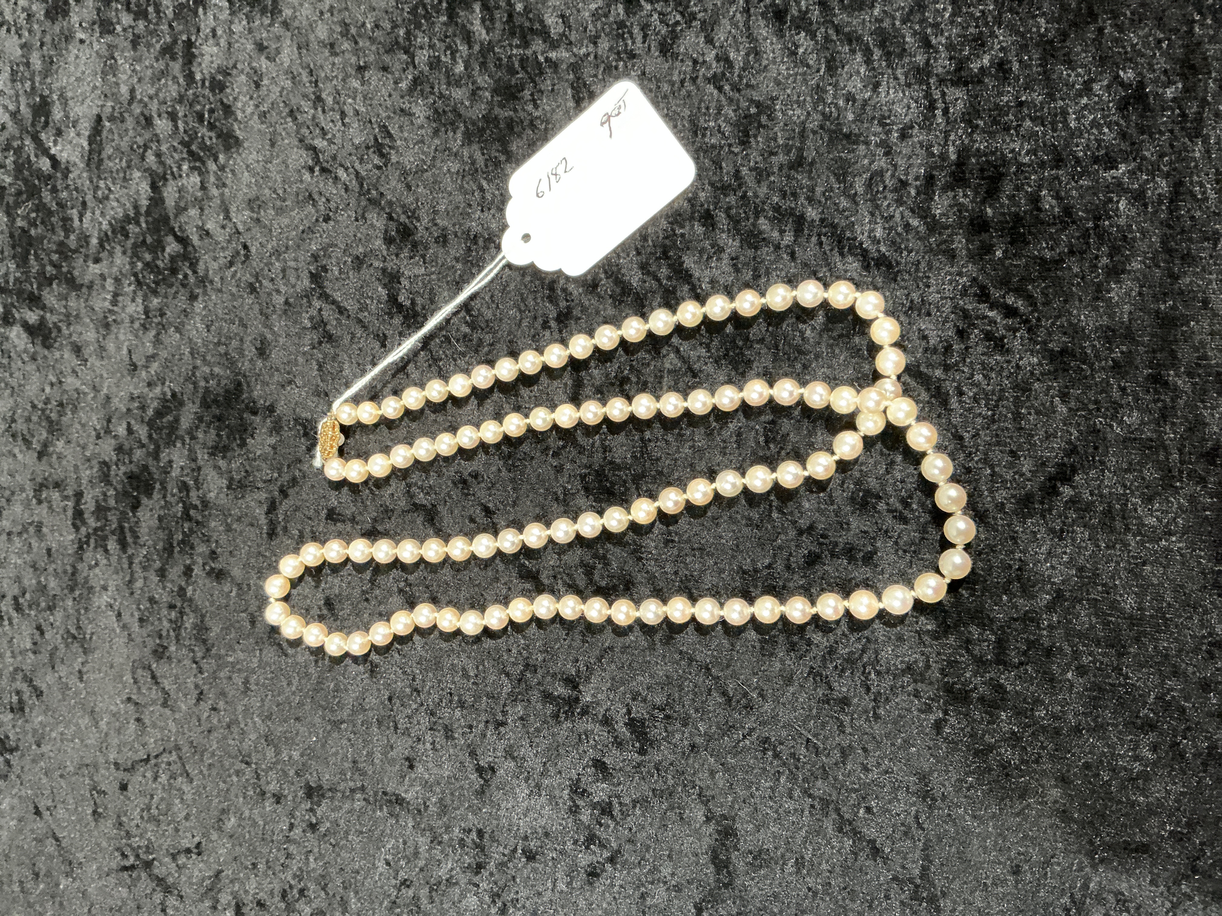 A single-strand necklace featuring a series of cream-coloured cultured pearls with a soft lustre, individually knotted on a white cord. The piece is secured with a yellow metal decorative box-style clasp, featuring an openwork swirl design set with a single small seed pearl to the centre. Based on the accompanying inventory tag and web consensus, the clasp is 9ct yellow gold. No hallmarks or maker’s marks are visible. Length approximately 30 inches.