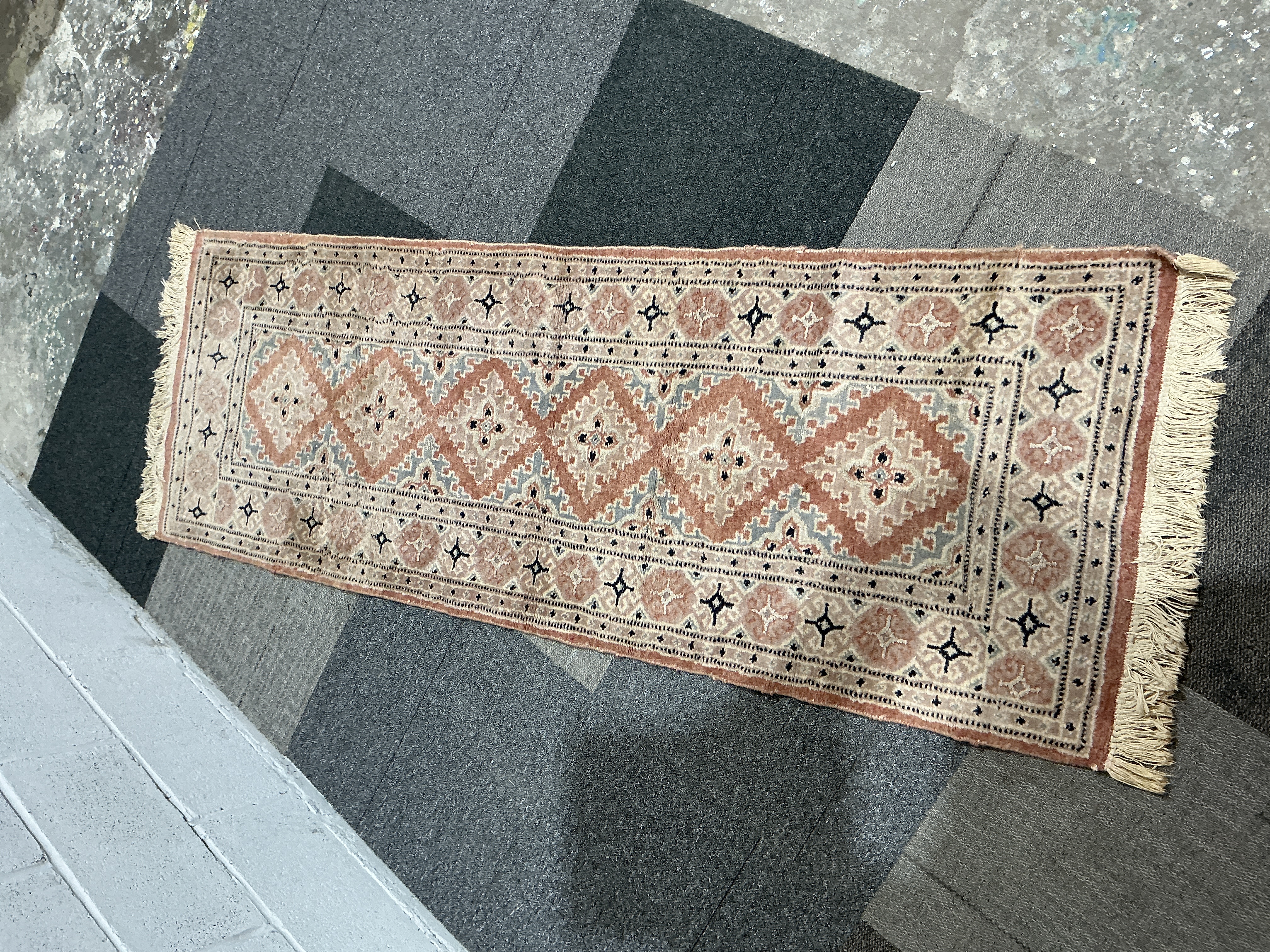 A vintage hand-knotted wool rug runner of Turkish Milas inspiration. The central field is decorated with five interlocking diamond medallions in salmon and cream tones, accented with charcoal and light blue geometric motifs including four-pointed stars. The design is enclosed by a geometric border. The rug features a wool pile on a wool or cotton foundation, showing characteristic abrash throughout the field indicating the use of varied dye batches. Dimensions: Length approx. 180 cm; Width approx. 60 cm.