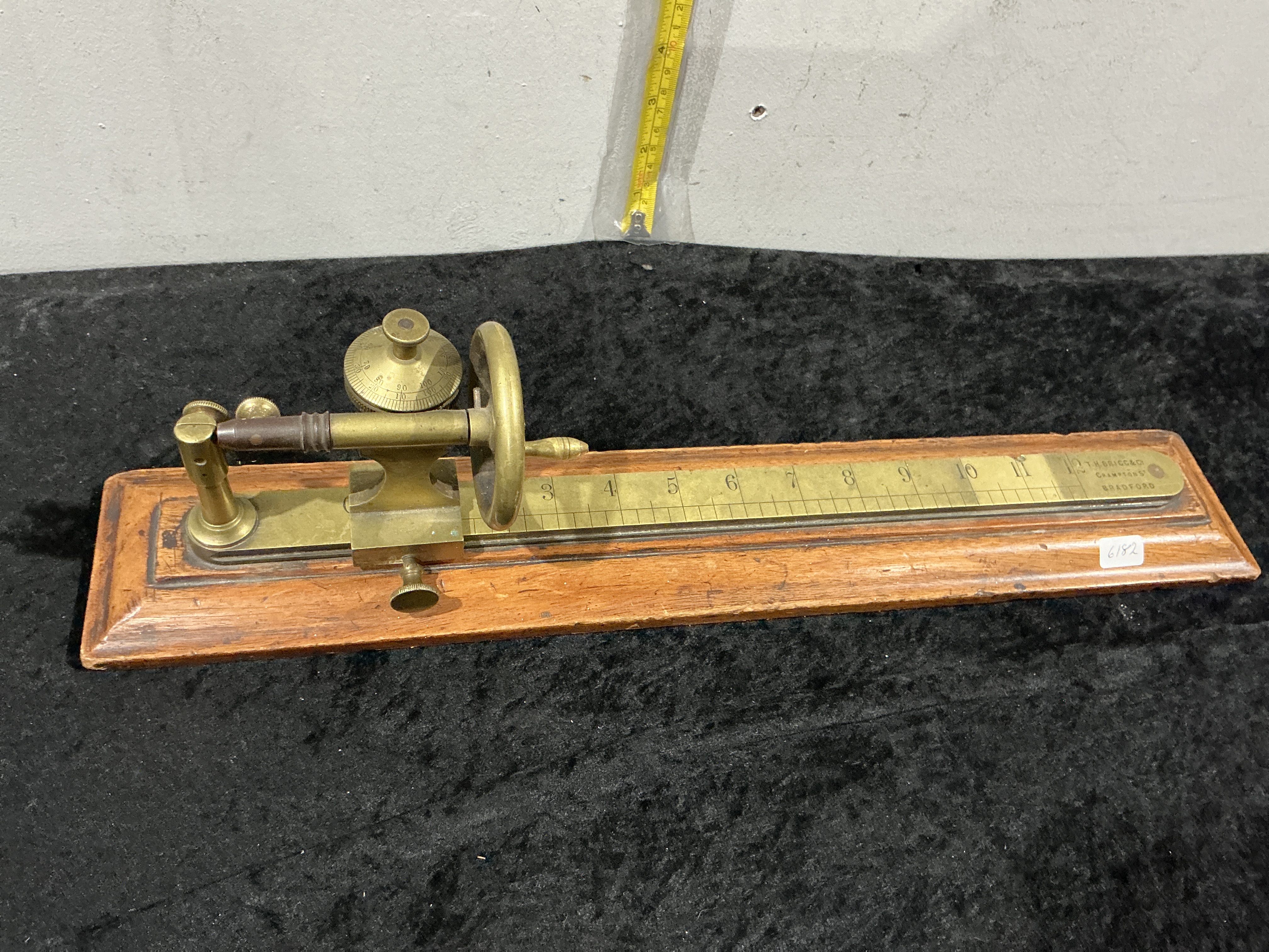 A fine late 19th to early 20th-century precision textile testing instrument, manufactured by T.H. Brigg & Co. at Crampton’s, Bradford. Constructed primarily from polished brass, the instrument is mounted on a heavy, moulded mahogany base. The main brass scale is graduated from 1 to 12 inches with finer subdivisions. The right-hand side of the scale is clearly engraved with the maker’s mark: T. H. BRIGG & Co / CRAMPTON’S / BRADFORD. The instrument features a sliding brass carriage operated by a large handwheel, supporting a vertical micrometer dial graduated from 0 to 100 for high-precision readings. A sighting assembly or pointer with a turned wood section is mounted to the carriage. This type of apparatus was typically employed in the Bradford woollen trade for measuring the elongation or tensile properties of yarn and thread.