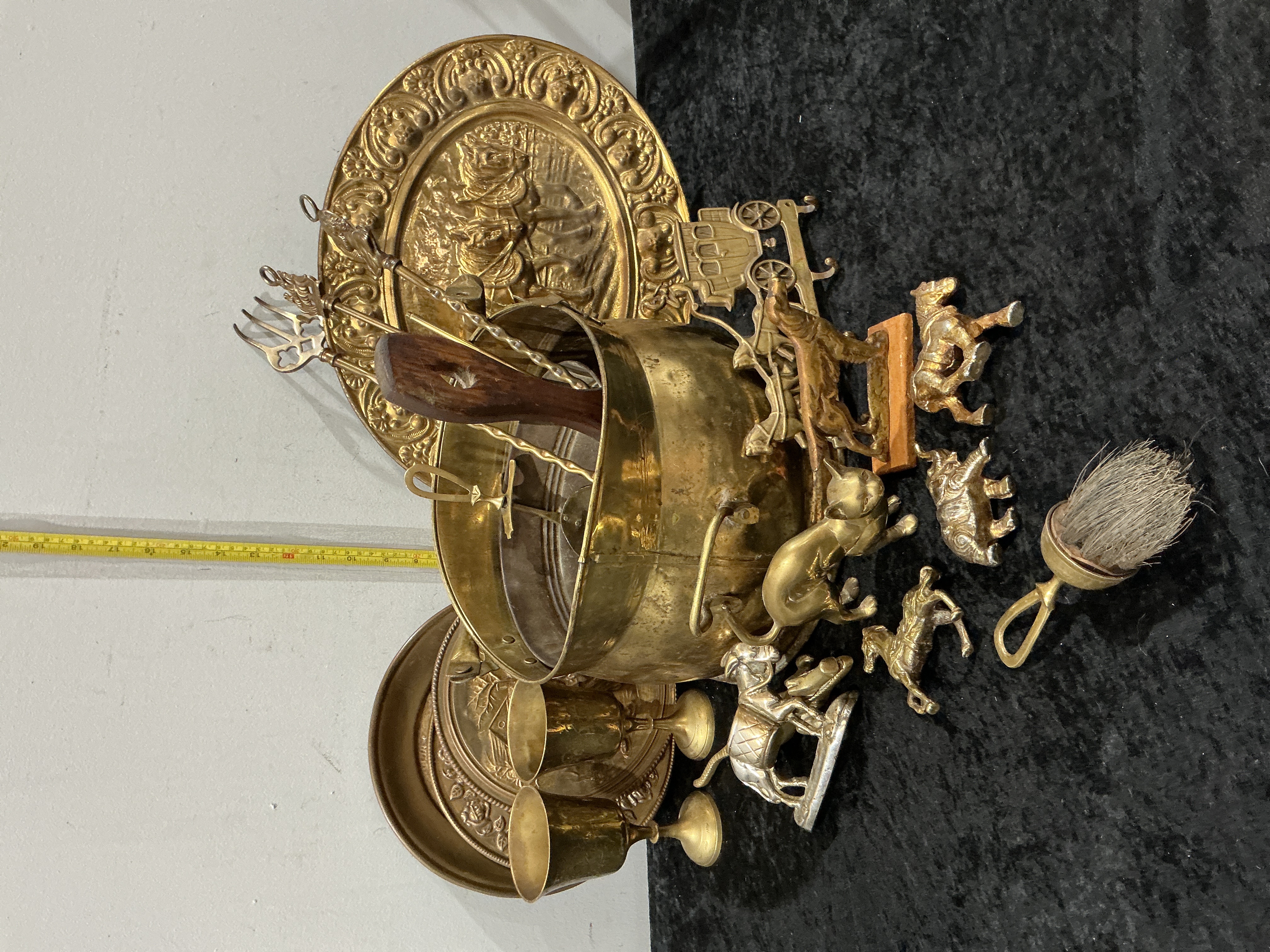 A varied collection of decorative brass and copper alloy items, primarily dating from the late 19th to mid-20th century. The assembly includes a large spun-metal bucket with a swing handle, and several circular chargers featuring detailed repoussé-work depicting traditional genre scenes of village life and tavern interiors. The lot further comprises a selection of long-handled fireside utensils, including a fork and ladles, alongside a pair of simple brass goblets. Notable cast figurines include various animal forms such as an elephant, horses, and a domestic cat, as well as a model of a horse-drawn carriage. Also included is a small hearth brush with a brass mount and natural bristles. These pieces demonstrate a range of metalworking techniques including casting, stamping, and spinning. Largest charger approximately 32 cm diameter. Bucket approximately 18 cm height.