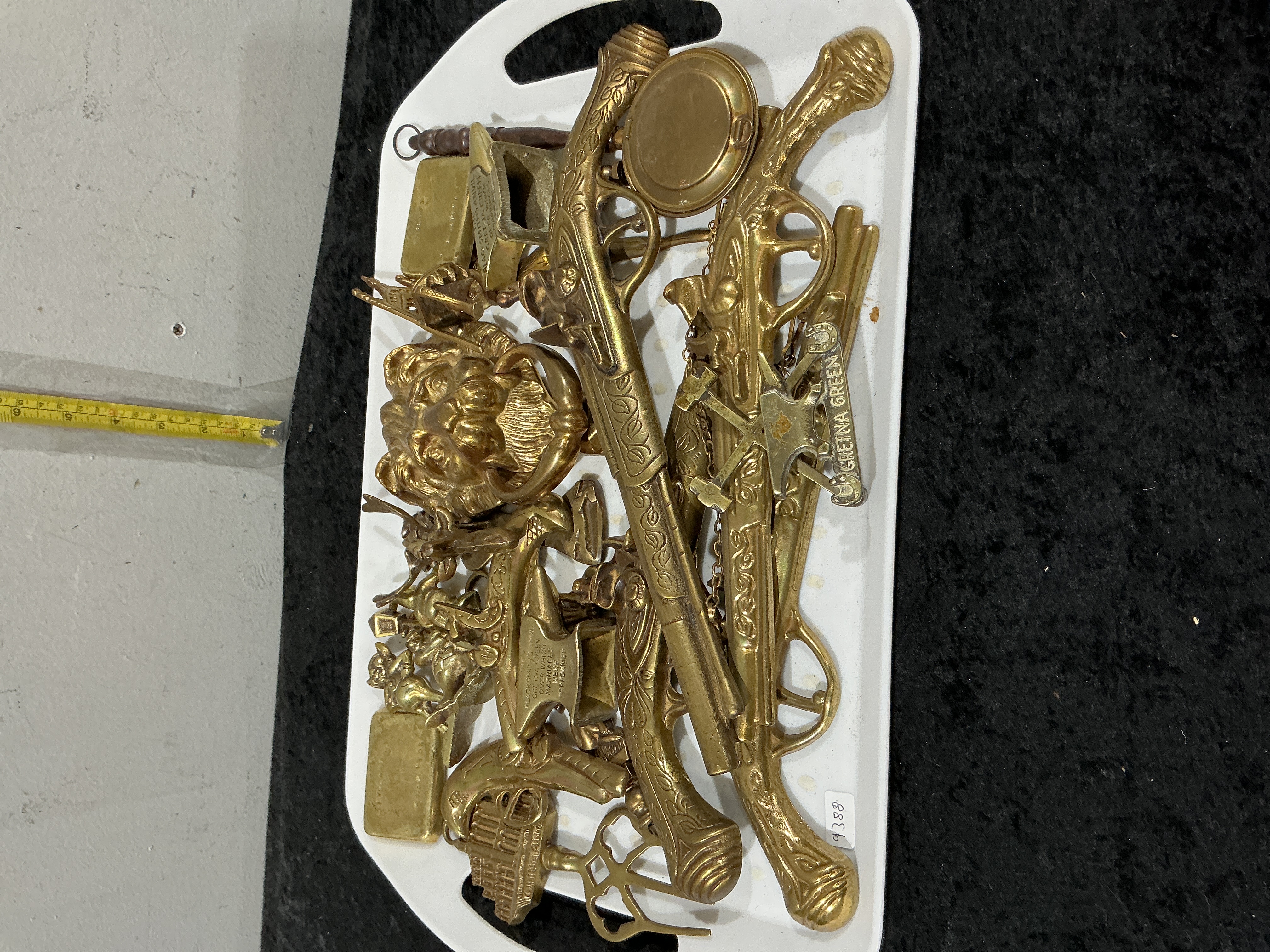 A diverse assortment of brass and gold-toned decorative metalware. The collection features a pair of large reproduction flintlock-style pistols, cast with ornate floral scrollwork and intended for wall display. Also included is a classic lion’s head door knocker with a circular striker. A significant portion of the lot comprises Scottish interest souvenirs from Gretna Green, including multiple anvil-shaped ornaments. One notable piece is embossed with the text BLACKSMITH’S ANVIL GRETNA GREEN OVER WHICH MARRIAGES WERE PERFORMED, referencing the historic site’s association with runaway weddings. Other items include a small brass bell, various plaques, and miniature figures. These pieces are typical of mid-20th-century British brassware production. The tray measures approximately 48cm by 32cm.