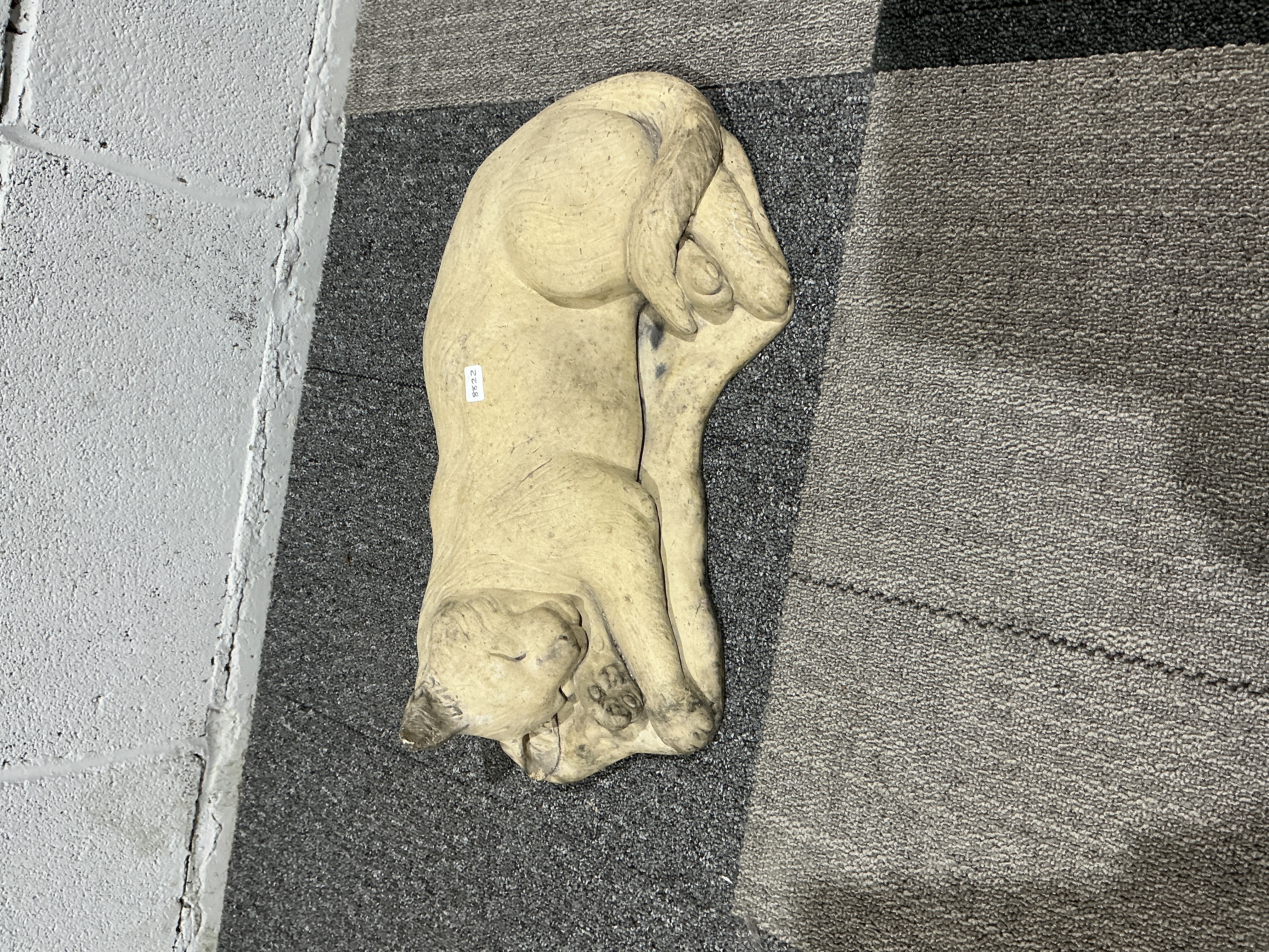An American Modernist cast stone or composite masonry sculpture of a sleeping puma, after the design by Heinz Warneke (1895-1983). The large cat is depicted in a naturalistic, curled pose with its head resting upon its paws and its tail tucked against the body. The piece is rendered in a light beige composite material with a textured surface characteristic of moulded masonry. Warneke was a celebrated sculptor known for his animalier subjects and was a leading proponent of the direct carving movement; this piece reflects his signature stylised yet organic approach to form. The sculpture exhibits a weathered patina consistent with outdoor display. Dimensions unavailable.