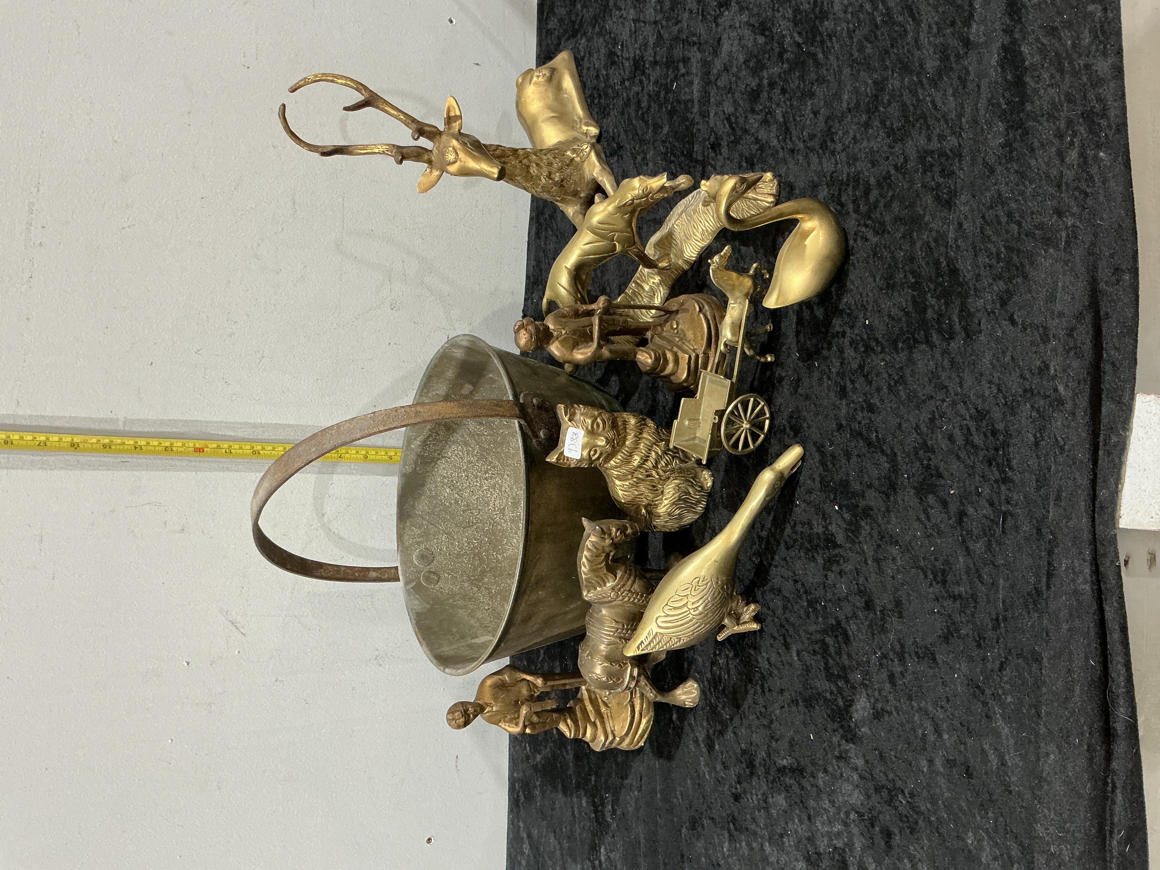 This collection comprises a variety of decorative yellow metal items, identified as brass. The assembly includes several cast figurines, featuring a large standing stag with prominent antlers, a seated cat with a textured coat, a goose, a swan, a fox, a sheep, and a horse-drawn cart, alongside a seated human figure. The lot also contains a cylindrical bucket with a swivel handle, fabricated from sheet metal with a rounded base. These pieces are characteristic of mid-20th-century household ornaments, produced using traditional casting and metalworking techniques. No maker’s marks or signatures are present. Bucket diameter approximately 15-18 cm.