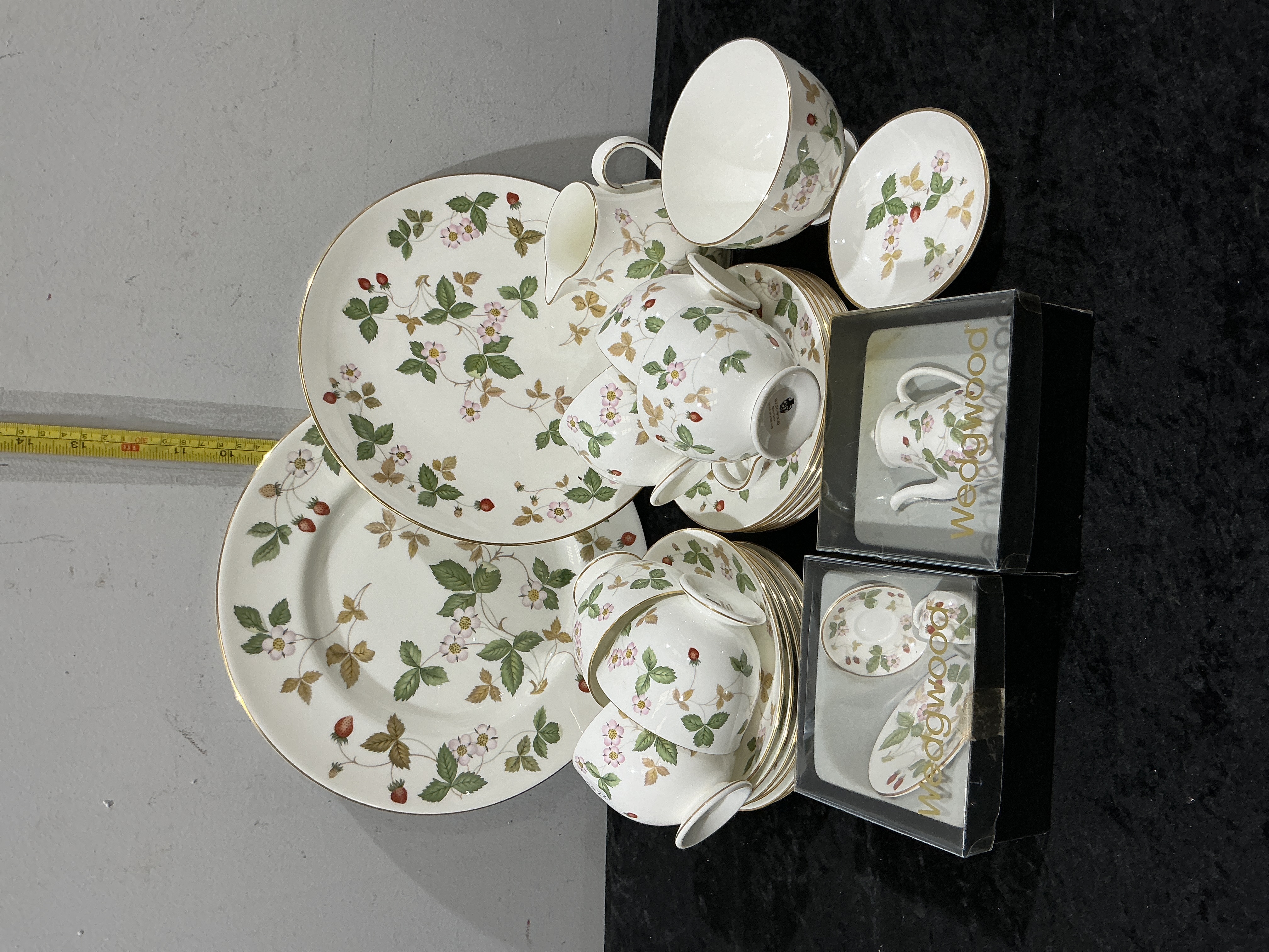 Wedgwood, England. Fine bone china. Transfer-printed decoration with hand-applied 22-carat gold gilding. Decorated in the Wild Strawberry pattern featuring trailing vines, red strawberries, and pink blossoms on a crisp white ground. Marks include the black Wedgwood backstamp to the base. This assembly includes two dinner plates, a cream jug, approximately seven teacups, twelve saucers, and two boxed miniature items including a teapot and a cup and saucer set. This pattern was first introduced in 1964 and has become a staple of contemporary English ceramic design. Dinner plates approximately 27 cm diameter.