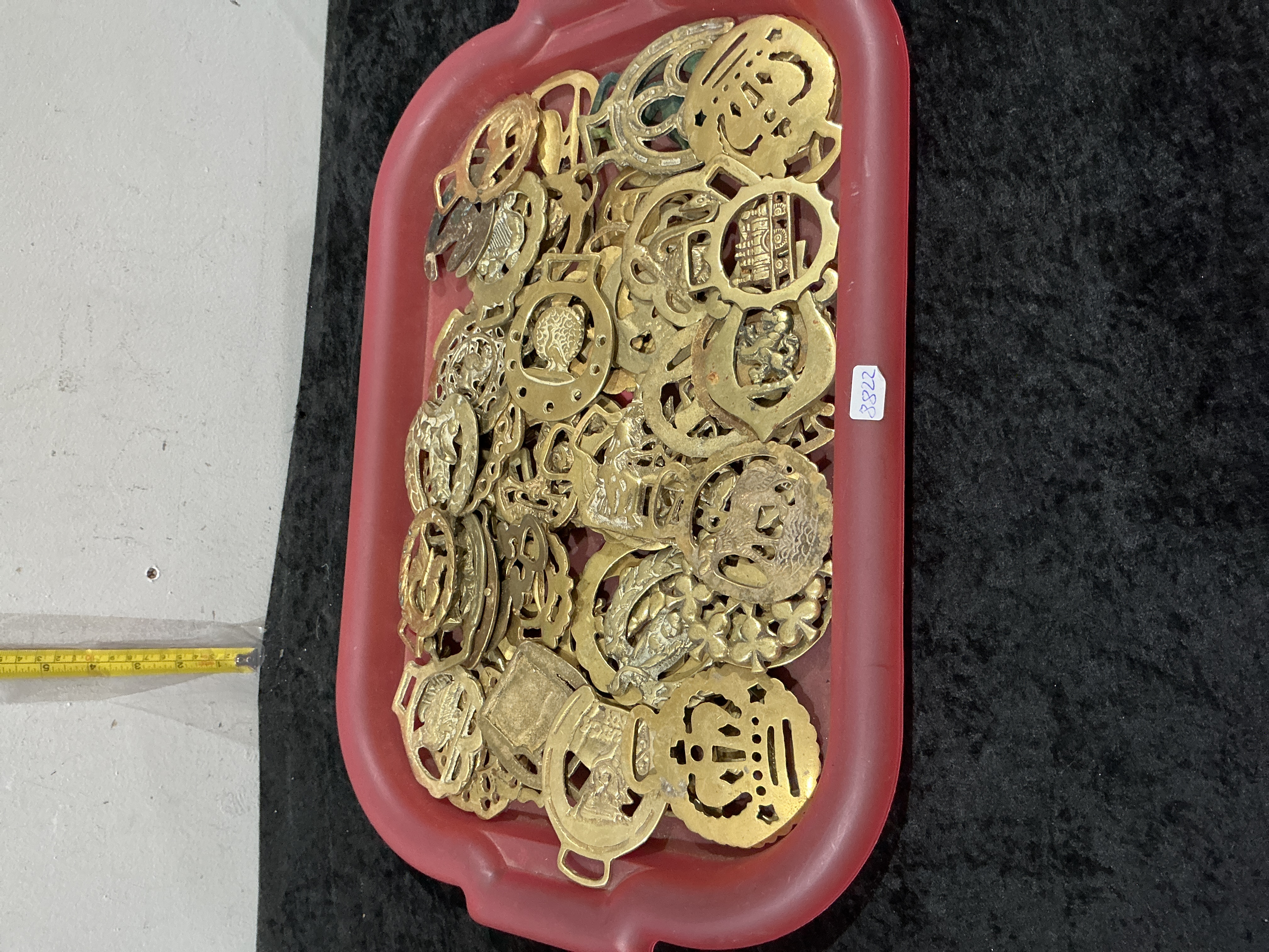 A substantial collection of traditional horse brasses, featuring a wide variety of cast designs. These decorative plaques were historically used to decorate the leather harnesses of draught and heavy horses. The assortment includes numerous motifs such as lions rampant, royal crowns, horses, various animals, and architectural elements. Each item is manufactured from cast brass, displaying the typical thickness and weight associated with these harness ornaments. The collection represents a broad cross-section of British equestrian folk art, including both traditional patterns and potentially commemorative designs. The items are presented in a red plastic tray bearing a lot label numbered 3822. The tray measures approximately 42 cm in length and 32 cm in width. Individual brasses generally measure between 7 cm and 10 cm in height.