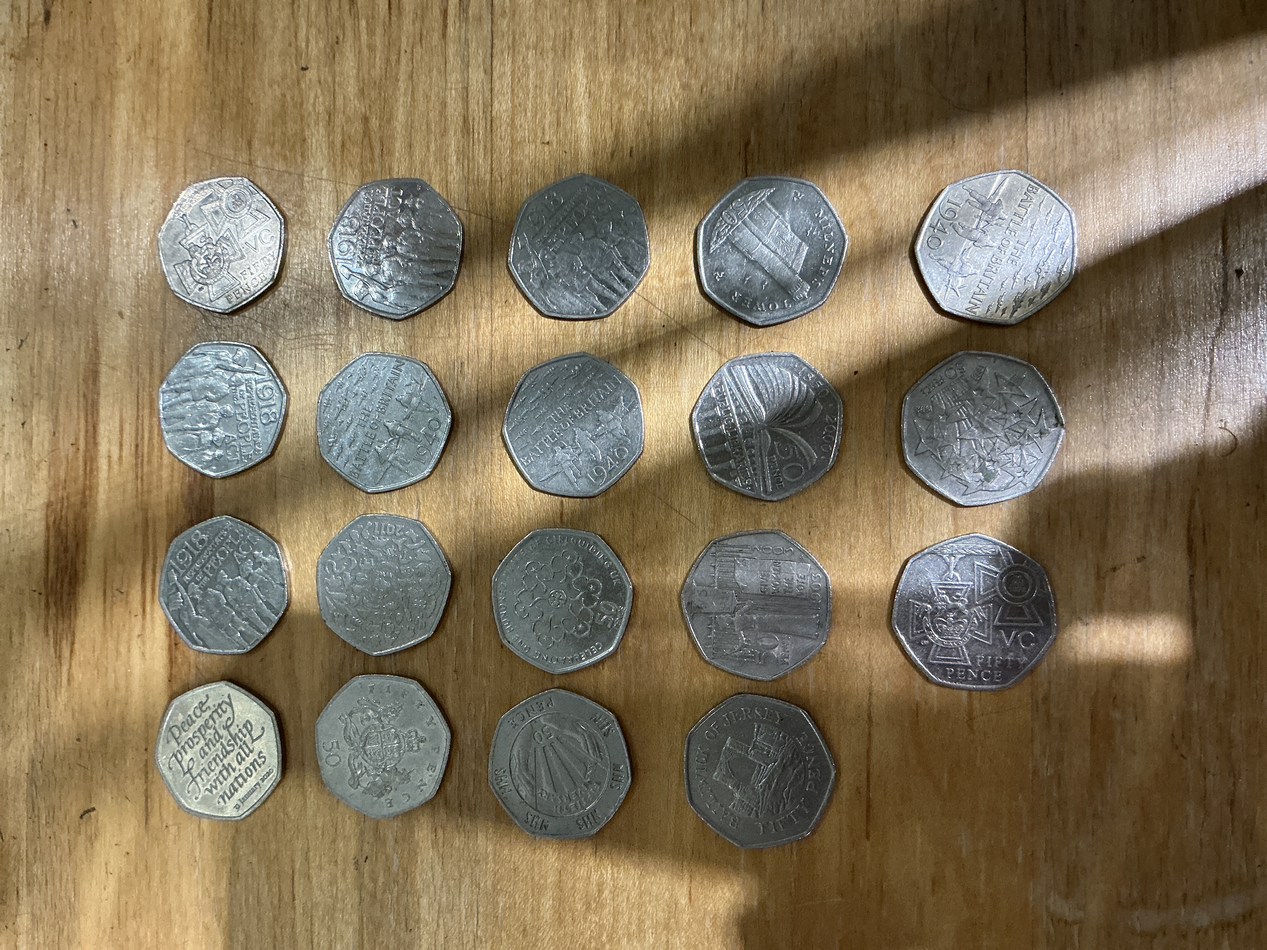 A collection of heptagonal 50 pence coins comprising various commemorative and definitive issues from the UK Royal Mint and the Bailiwick of Jersey. Catalogued types include the 1998 National Health Service (KM-997), 2003 Women’s Social and Political Union (KM-1038), 2006 Victoria Cross (KM-1055 and KM-1056), 2007 Scouting Movement (KM-1075), 2010 Girlguiding Centenary (KM-1149), 2015 Battle of Britain (KM-1300), 2018 Representation of the People Act (KM-1533), 2020 Withdrawal from the European Union (KM-1715), and the Royal Shield of Arms definitive (KM-1112). The lot also includes a Bailiwick of Jersey issue featuring Mont Orgueil Castle (KM-118).