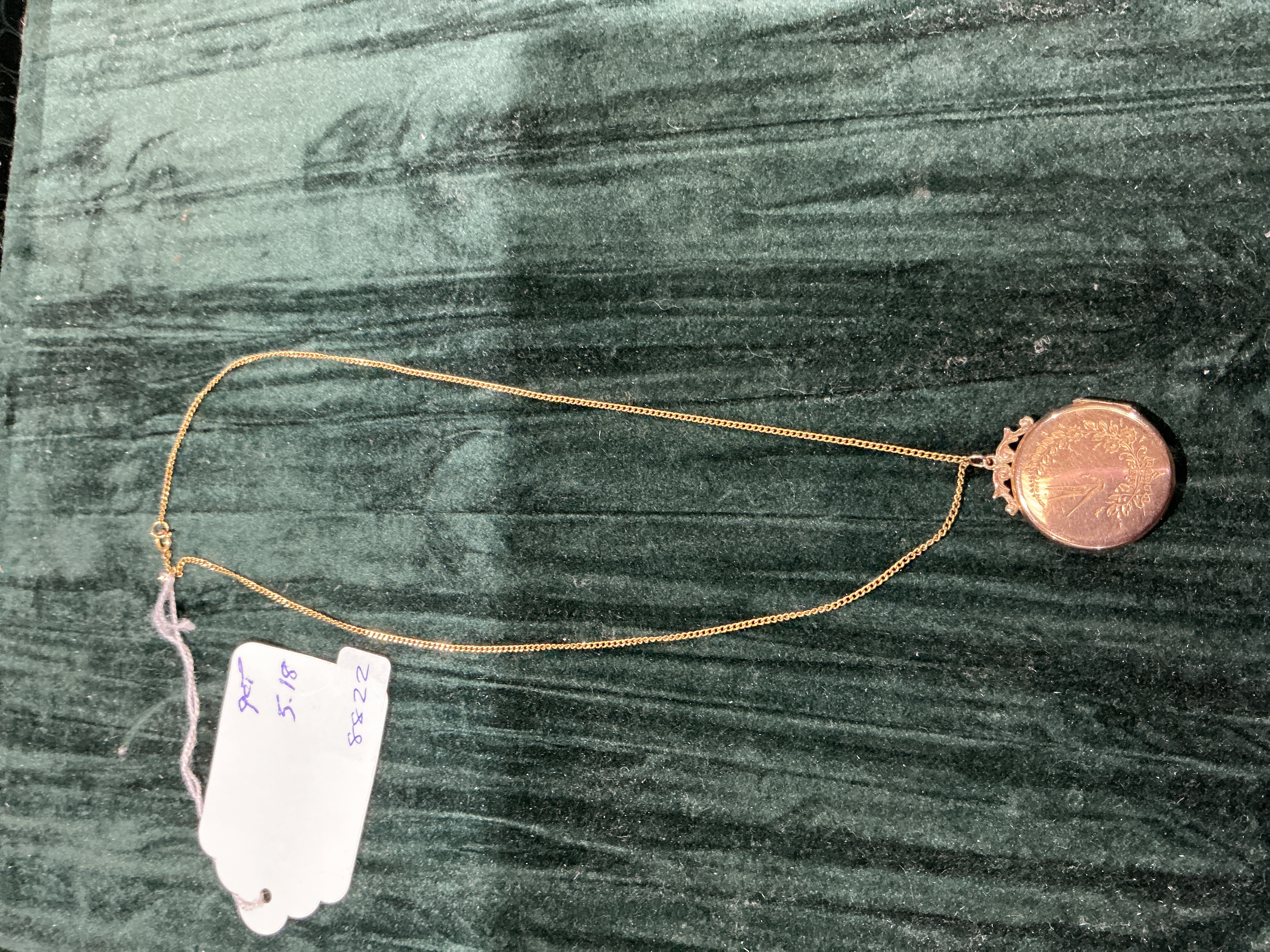 This necklace is crafted from yellow gold and features a circular locket-style pendant suspended from a fine curb-link chain. The pendant is designed with a decorative scrollwork bale and a front face featuring an engraved laurel wreath border surrounding a central stylized monogram. While no hallmarks are clearly visible on the metal, the accompanying jeweller’s tag and provided data indicate a 9 carat gold composition. The locket appears to be of a vintage style, typical of early 20th-century sentimental jewellery. Gross weight: 5.18 grams.