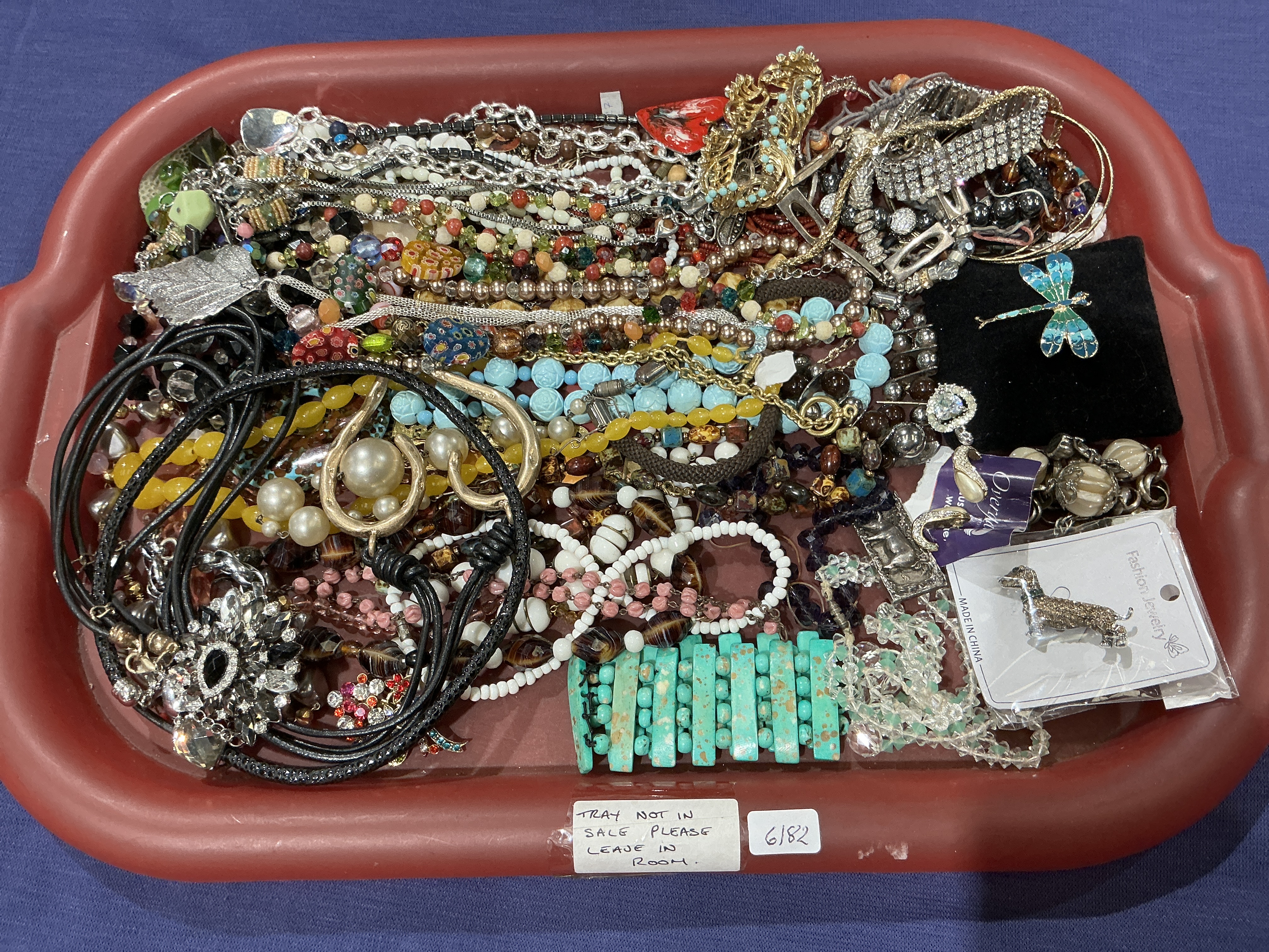 A comprehensive collection of costume jewellery comprising an assortment of necklaces, bracelets, brooches, and earrings. The pieces are primarily constructed from gold-tone and silver-tone base metals. The lot features a variety of beaded strands including glass, plastic, and imitation turquoise, alongside corded necklaces and metal chains. Notable items include a large turquoise-coloured panel bracelet, an enamelled dragonfly brooch, a rhinestone-set dachshund pin in its original retail packaging marked Fashion Jewellery, and a substantial floral-motif brooch featuring faceted clear crystals which appear to be synthetic. Construction techniques range from simple bead stringing and wire-wrapping to cast metal components and prong-set stones. No hallmarks, purity stamps, or maker’s marks were observed during inspection. This unsorted collection represents a mix of vintage and modern styles suitable for wear, resale, or craft purposes. Weight and measurements: Not provided.
