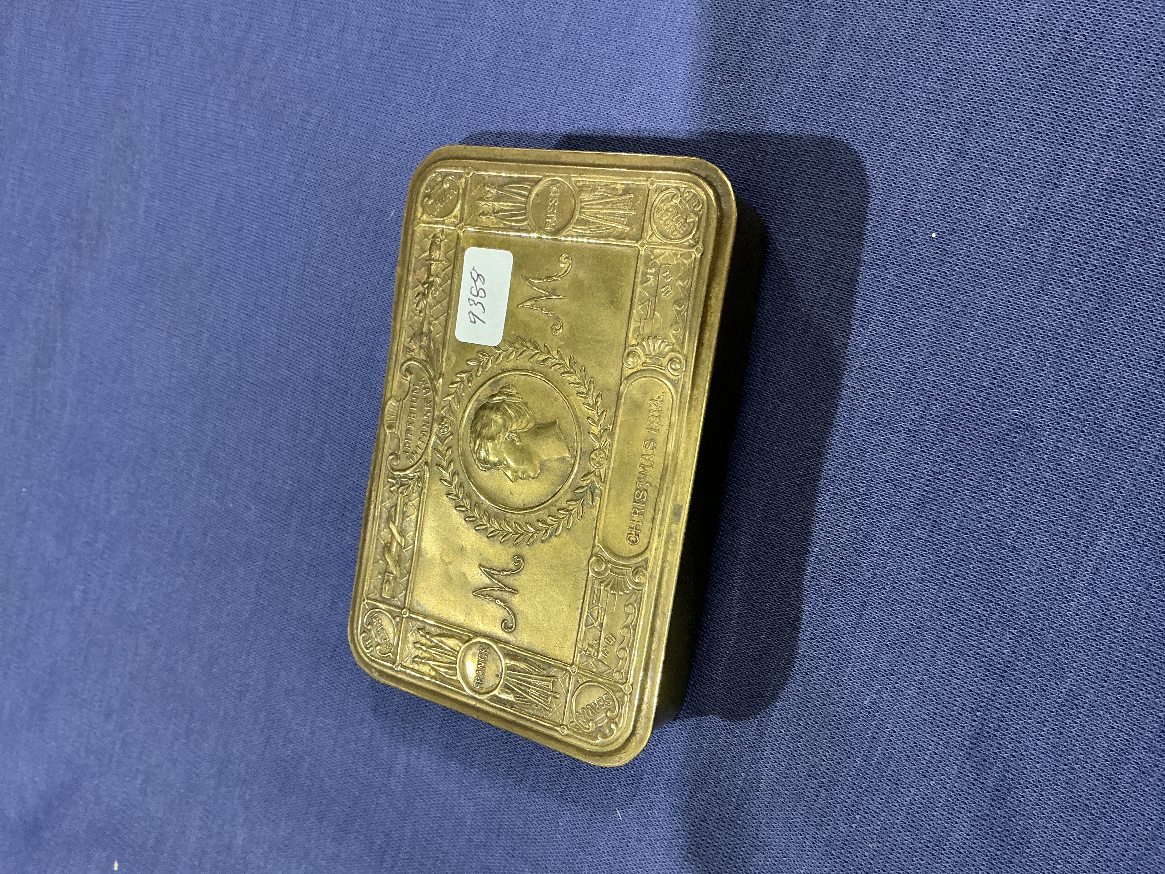 A World War I Princess Mary Christmas gift tin, dated 1914, manufactured from embossed brass with a hinged lid. The lid is decorated with a central profile portrait of Princess Mary within a laurel wreath, flanked by “M” monograms. The design includes the inscriptions IMPERIUM BRITANNICUM and CHRISTMAS 1914. The outer border is embossed with the names of Allied nations, including France, Russia, Belgium, Servia, Japan, and Montenegro. The tin is of rectangular form with rounded corners.