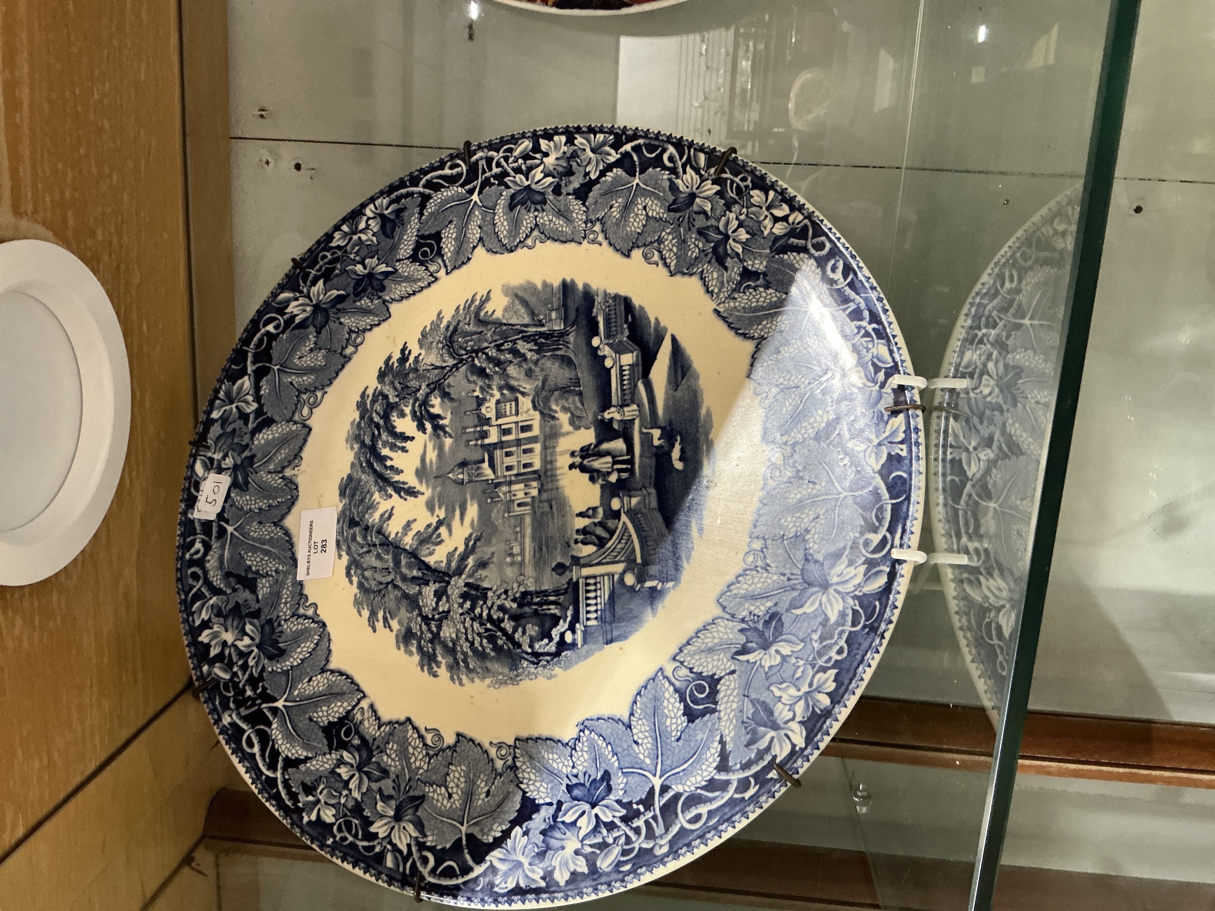A large English ironstone charger manufactured by Mason’s, featuring the iconic Vista pattern. The piece is decorated with an underglaze cobalt blue transfer-print on a cream earthenware body. The central scene depicts a romanticised architectural landscape with a grand manor house, figures, and terraces, surrounded by a dense border of grapevines and foliage. This pattern is a classic representation of mid-19th century British ceramic design. No maker’s marks are visible on the face; the reverse is fitted with a metal display hanger. Diameter: Approximately 32 cm.