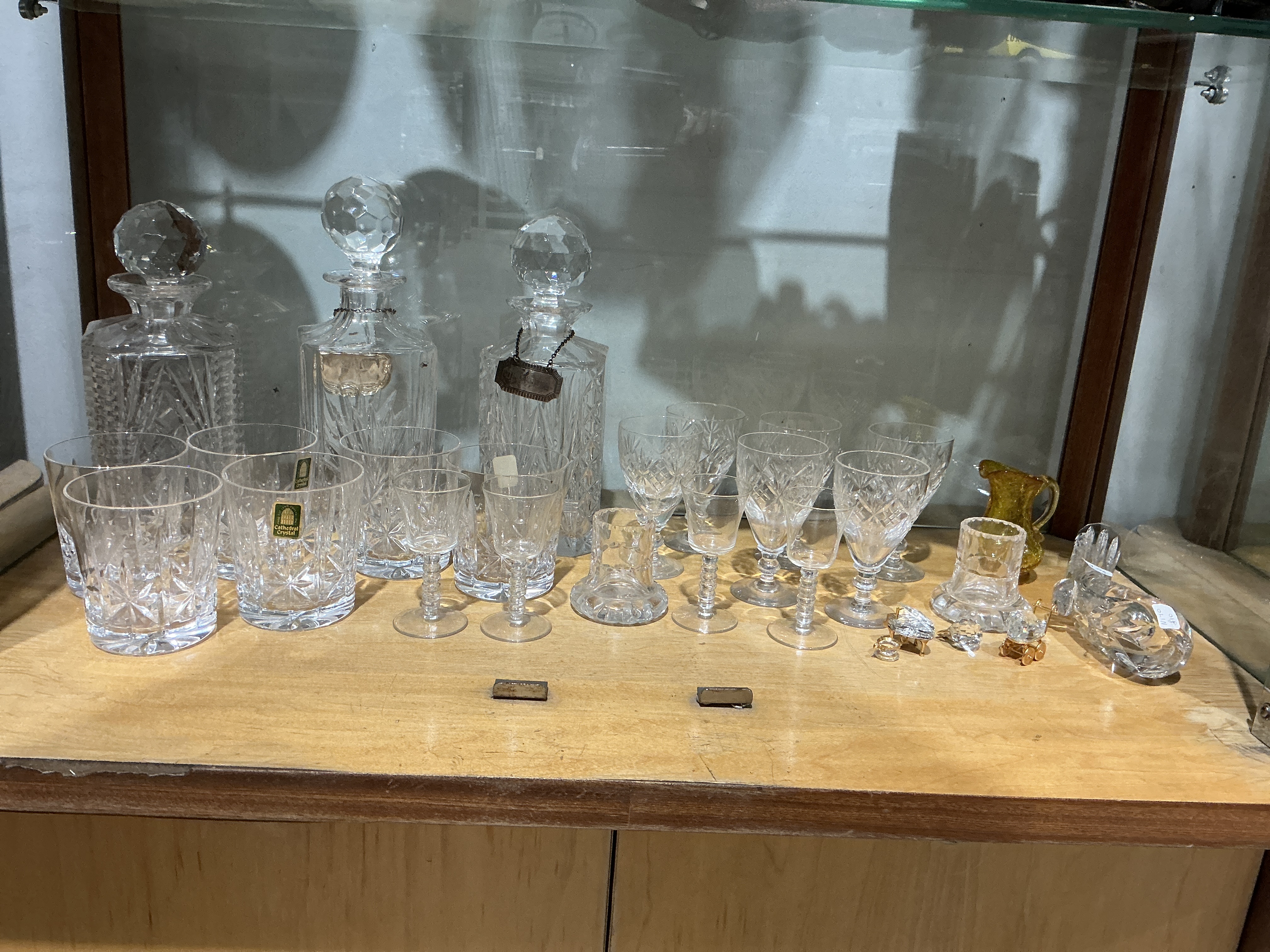 This extensive assembly of decorative and functional glassware primarily features intricate diamond, star, and fan-cut patterns characteristic of traditional lead crystal. The collection includes three decanters of varying forms, each topped with a multifaceted spherical stopper; two of these are adorned with suspended metal liquor labels. The suite of drinking vessels comprises four large tumblers, one of which retains an original adhesive label for Cathedral Crystal, alongside an assortment of wine glasses and smaller aperitif stems featuring faceted or notched stems. Supplemental pieces include a small amber-coloured glass creamer, two miniature clear glass vessels, and a selection of small crystal and metal-toned figurines, including a faceted swan. The items represent a mix of manufacturers, likely including Bohemian and contemporary crystal houses such as Cathedral Crystal. Measurements: Decanters approximately 25cm to 30cm in height.