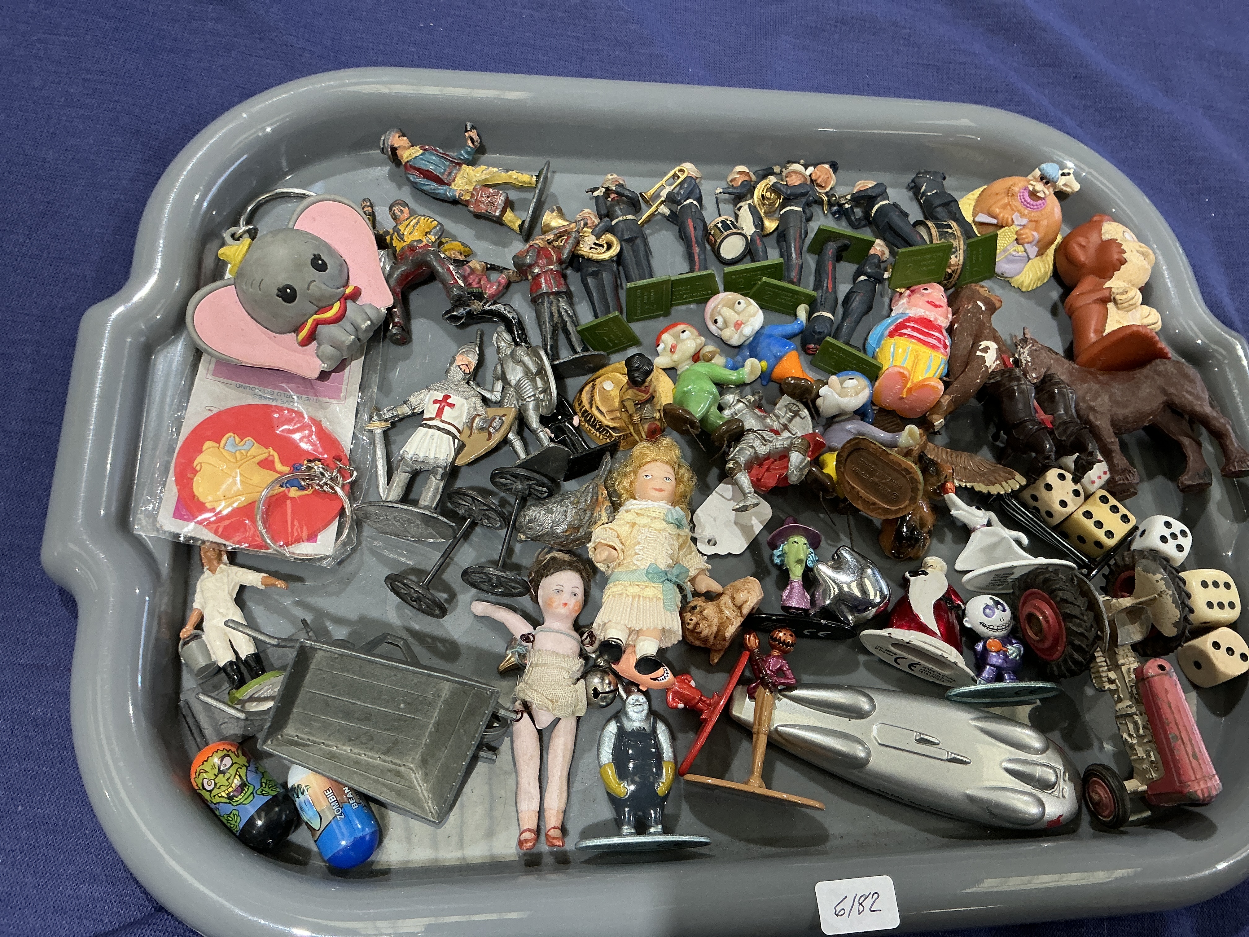 This comprehensive assortment features a wide variety of collectibles spanning several decades of the 20th and early 21st centuries. The lot includes a selection of metal military figures, notably a marching band in uniform and historical soldiers, alongside a medieval knight with a red cross shield. Two small dolls are present, including a bisque-style figure with jointed limbs and another dressed in a knitted cream outfit. Automobilia items include die-cast metal vehicles, such as a streamlined silver racing car and a red tractor. Character-based and promotional items include a Disney Dumbo keychain, various gnomes, a witch, and Santa Claus figurines, as well as modern Zombie Bean capsule toys. Additional items comprise a miniature grey metal cart, several gaming dice, and various plastic figurines. Materials used in construction include lead, die-cast alloys, plastic, vinyl, and ceramic. No measurements are provided as no scale is present in the image.